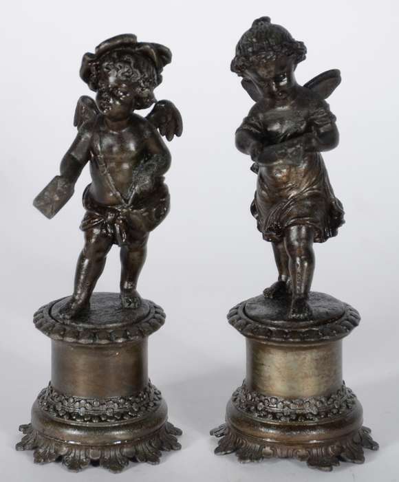 Par de antigas esculturas de petit bronze, representando casal de crianças anjos, sobre pedestais com flores em relev...