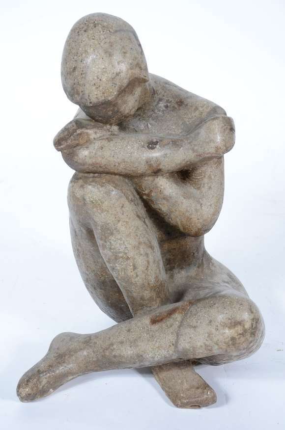 Escultura de pedra sabão representando figura feminina. Pé colado. Assinada.