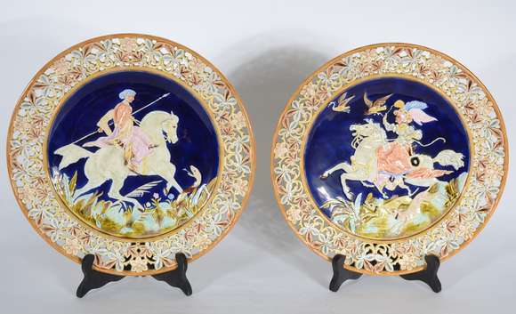Par de medalhões de cerâmica austríaca majolica - Josef Steidl - Znaim, decorados com casal a cavalo em relevo policr...