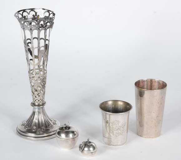 Cinco peças diversas de prata, sendo vaso floreira (amassados), dois copos um deles contraste 800 mls e duas porta pi...