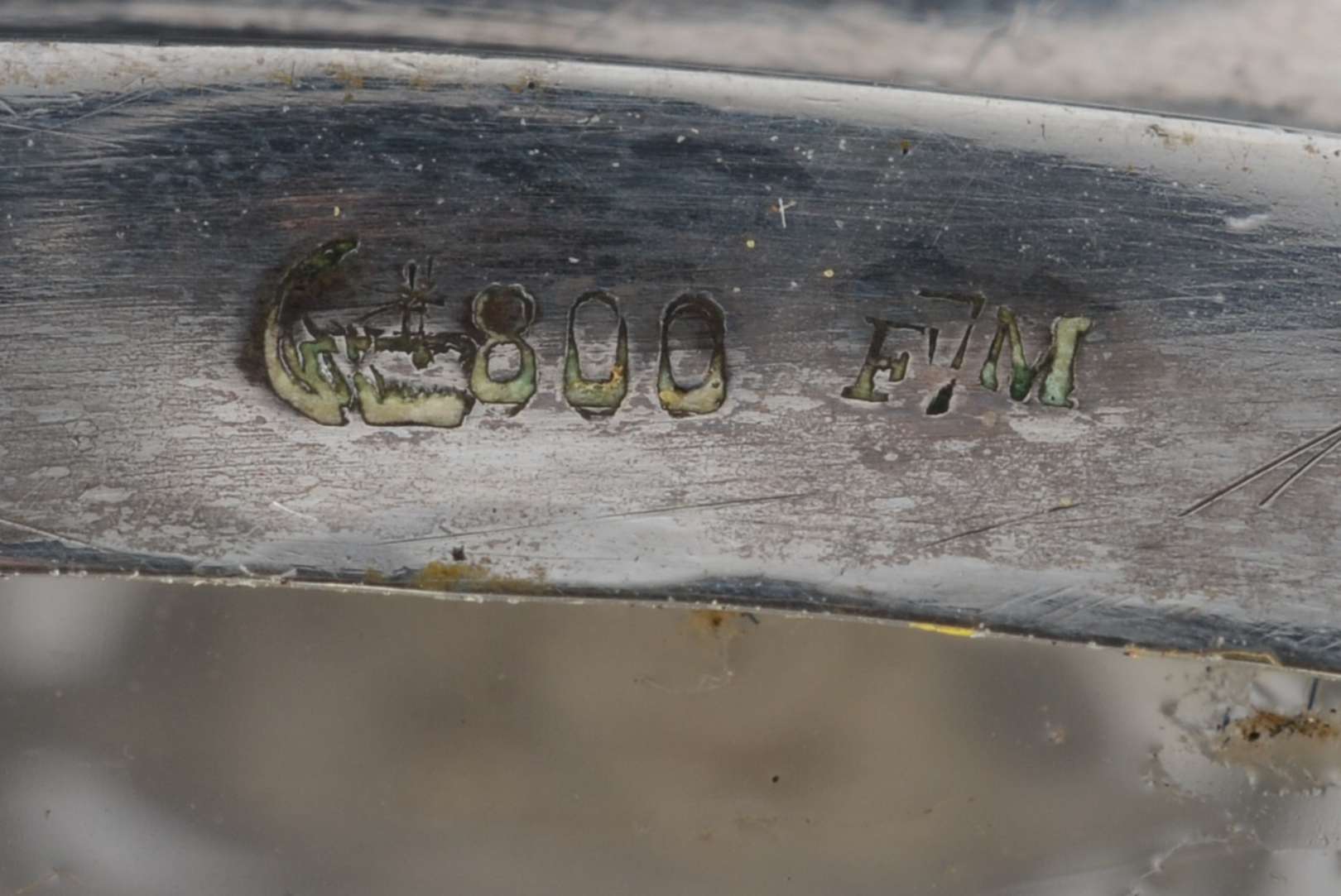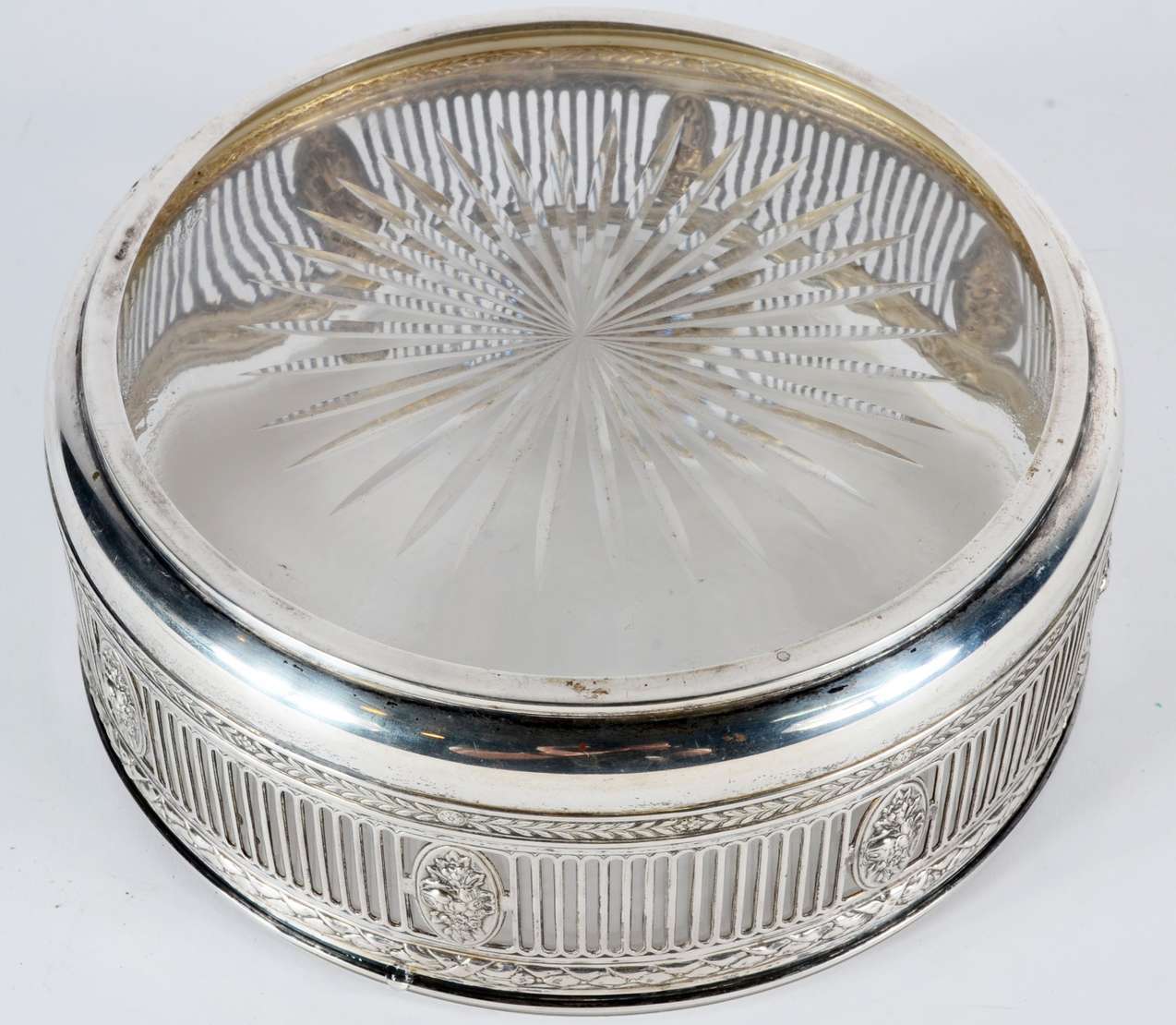Tinteiro de cristal com tampa de prata de lei e monograma.