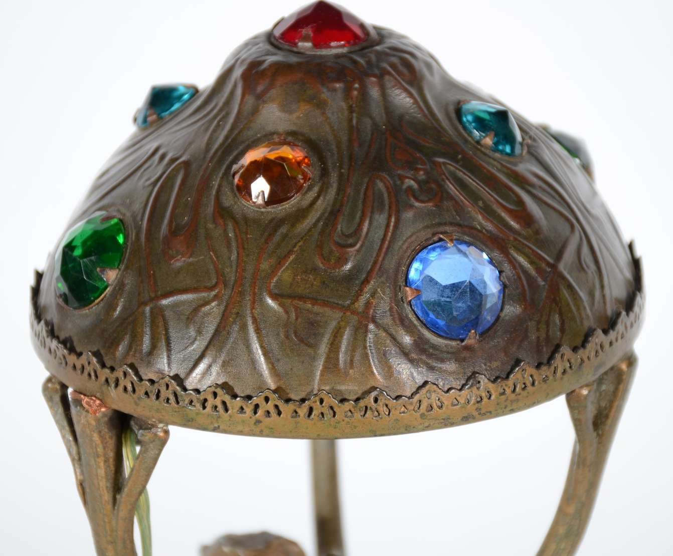 Fragmento de madeira entalhada e dourada com cornucópia, cachos de uvas e outros elementos.