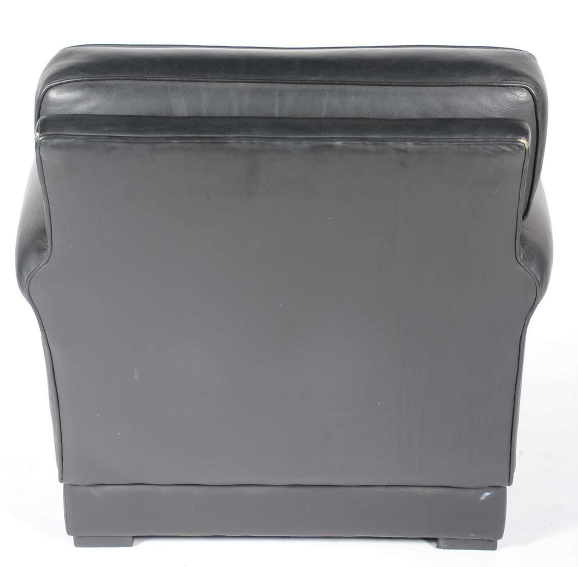 Sofá para 2 lugares estofado e forrado de couro preto, almofadas soltas.