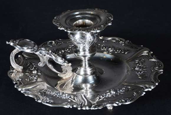 Belíssimo par de tocheiros de prata de lei, trabalhados com palmas e concheados em relevo, Brasil, Século XVIII. Peso...