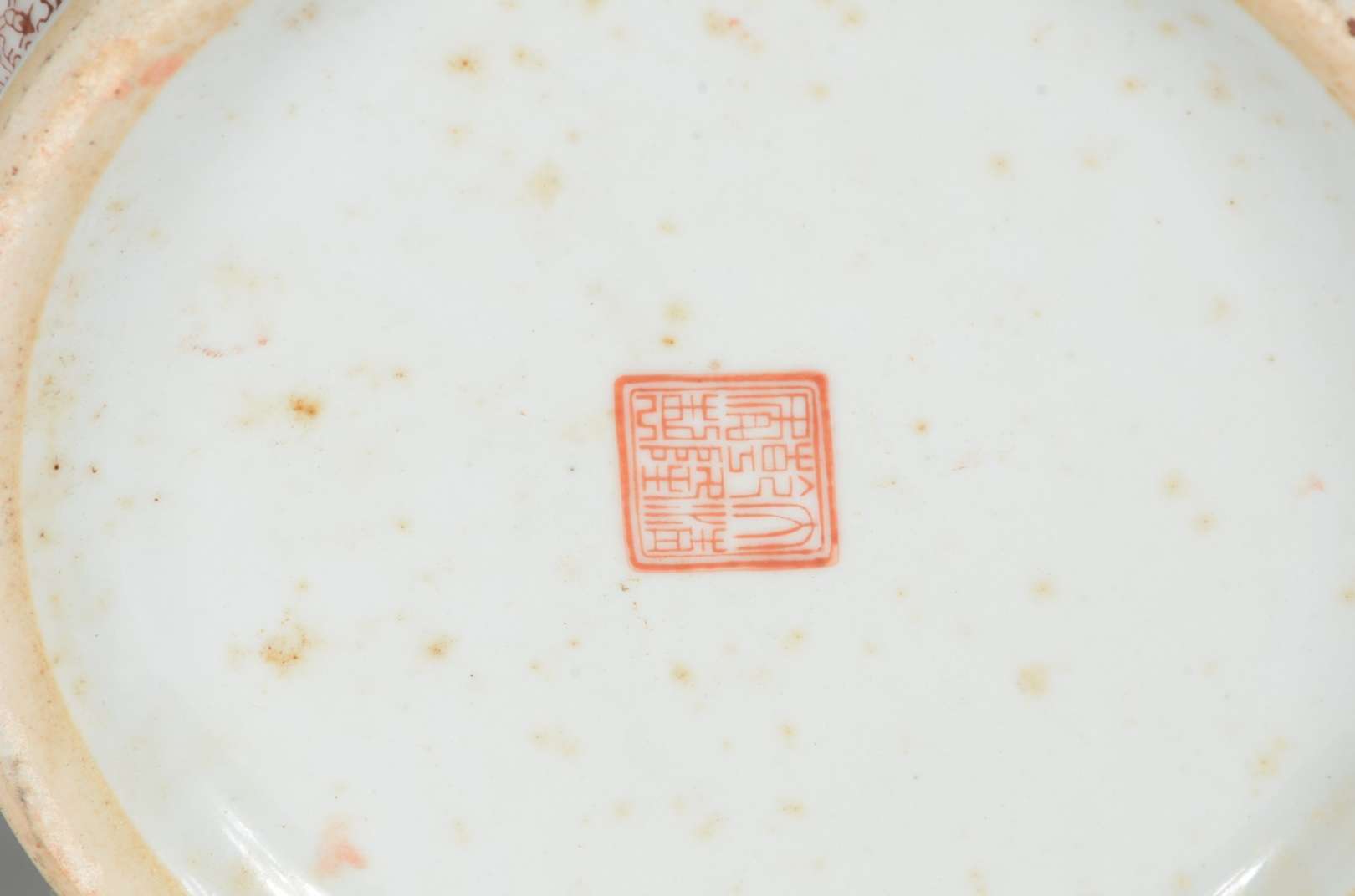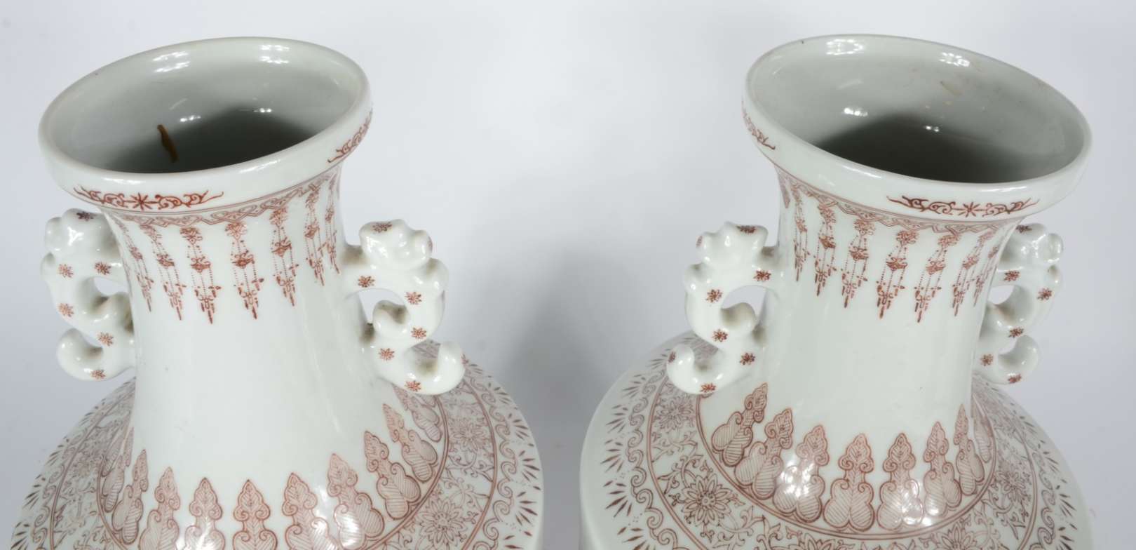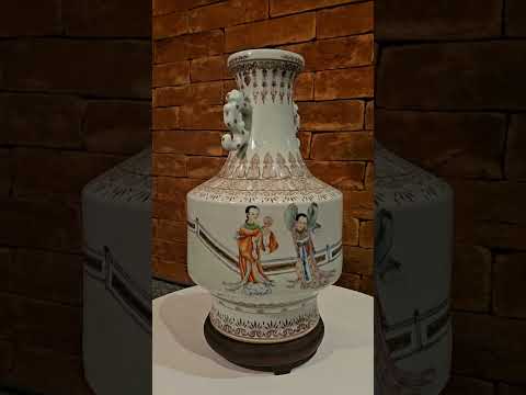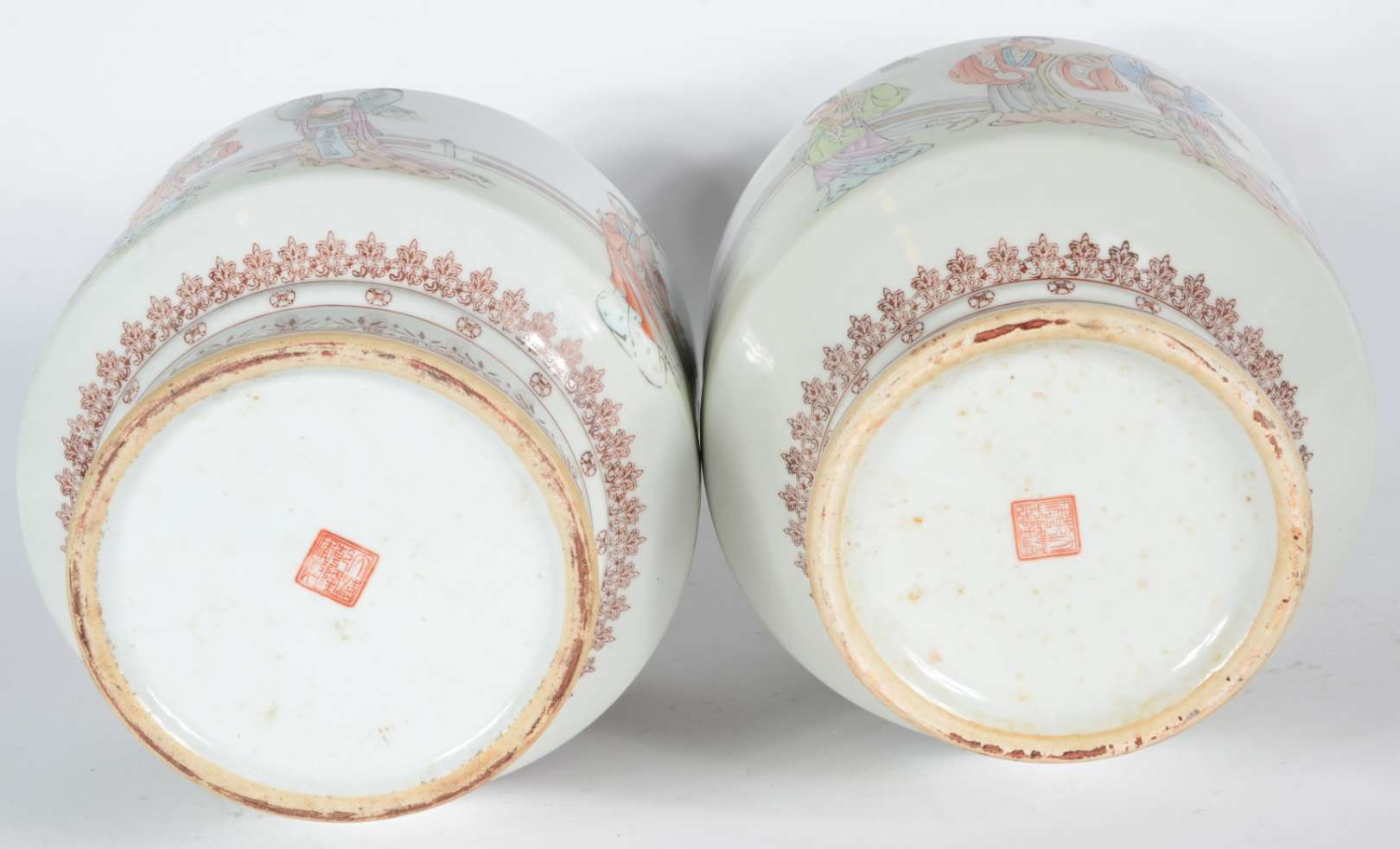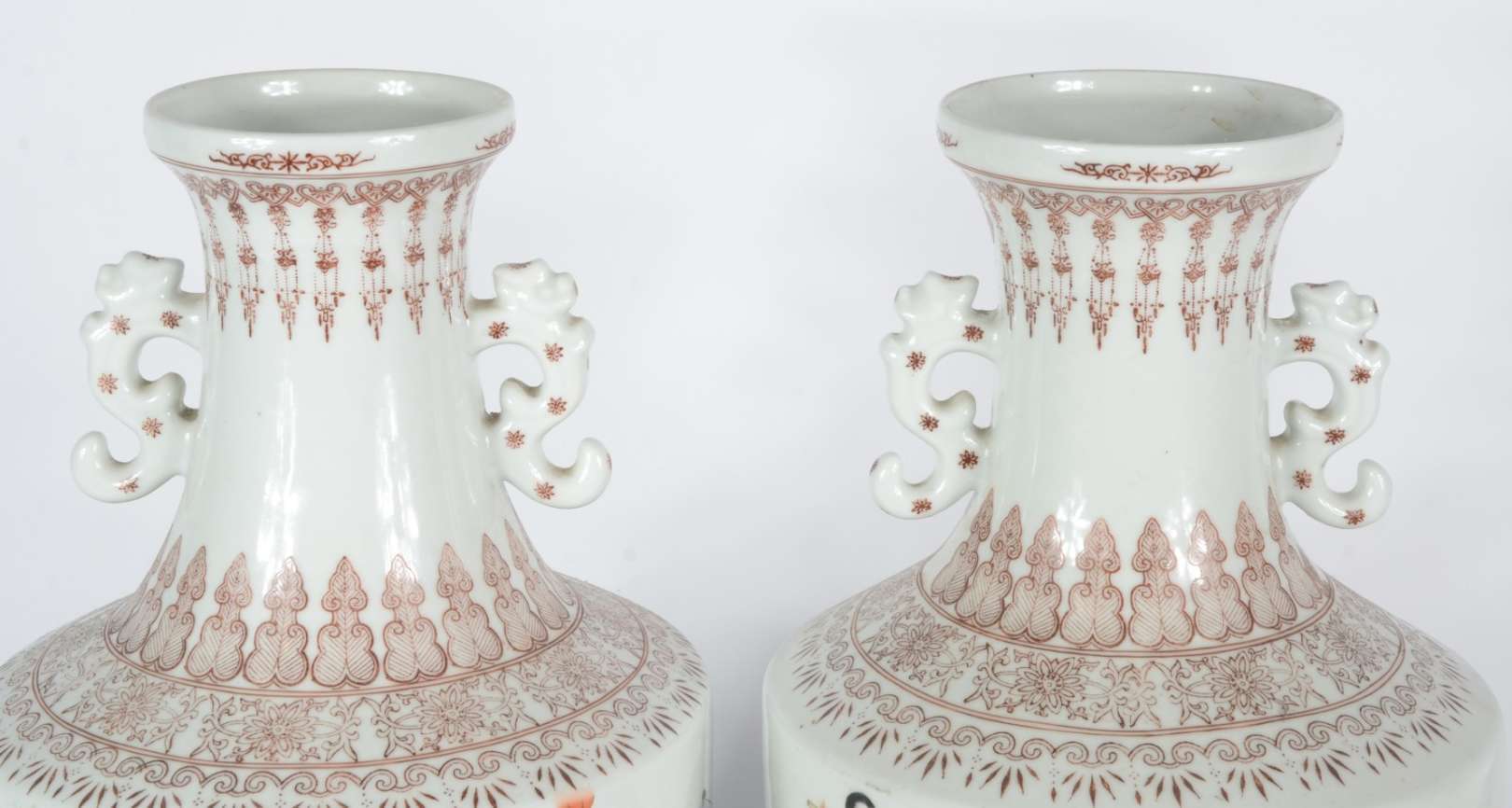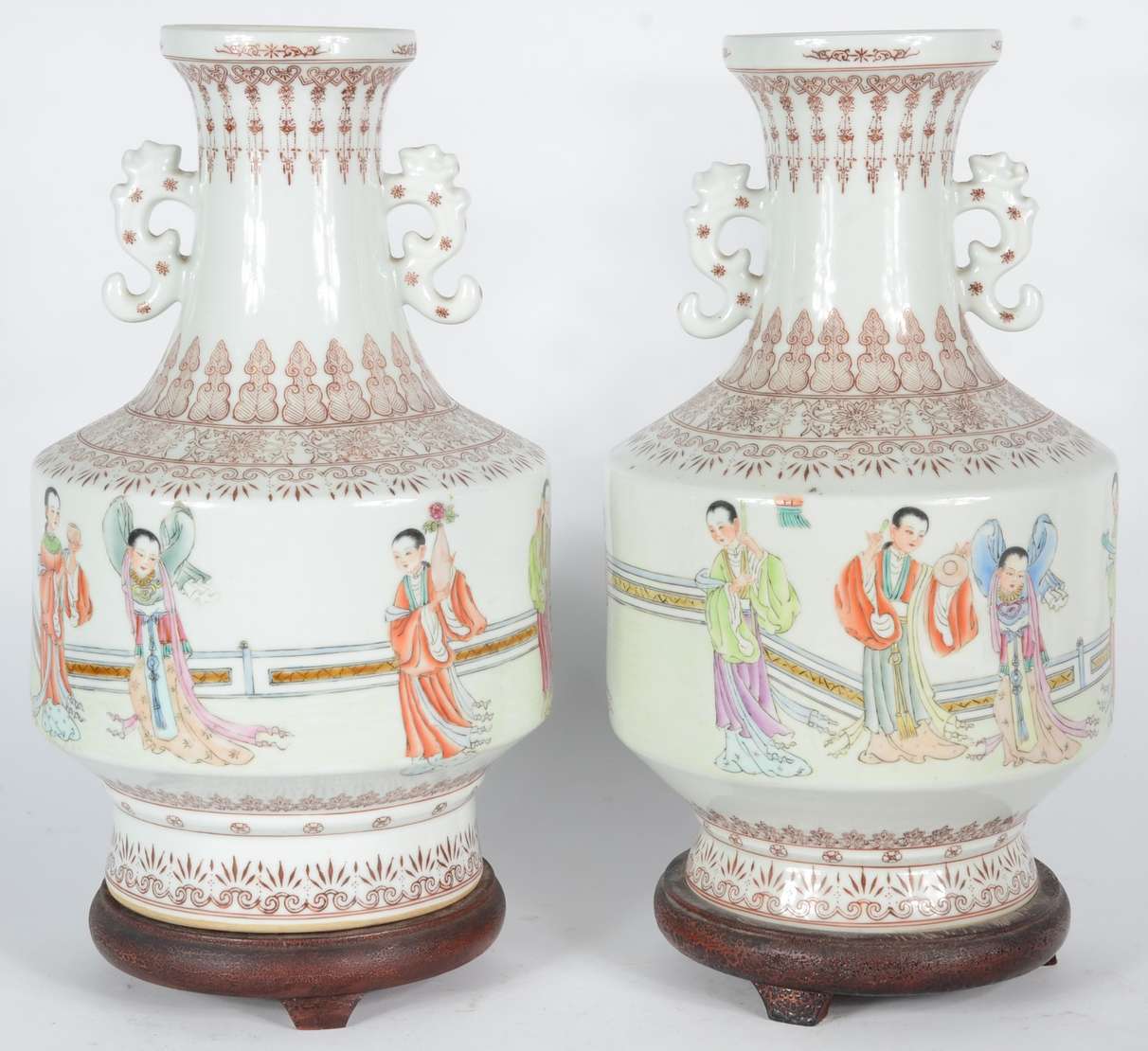 Par de vasos balaústres em porcelana chinesa, decorados em sépia por numerosos frisos com estilizações variadas, centralizando largas faixas policromadas. Partes centrais dos bojos de formato cilíndrico, ornamentadas por musicistas e dançarinas. Gargalos em corneta, ladeados por pegas em dragões. Bases circulares retraídas, levemente esparramadas. Marcas apócrifas do reinado Qianlong sob as bases. Século XIX.