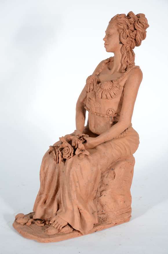 Escultura em barro cozido representando figura feminina sentada com flores no colo.