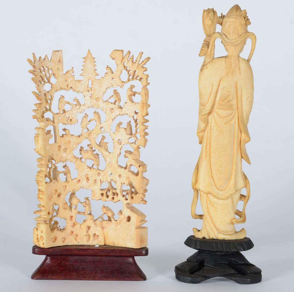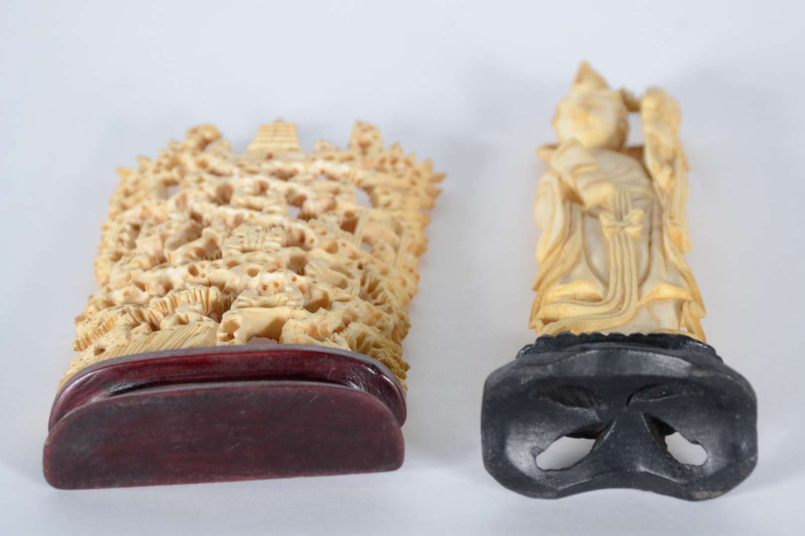 Estatueta de marfim com policromia representando duas figuras, uma delas com cajado.