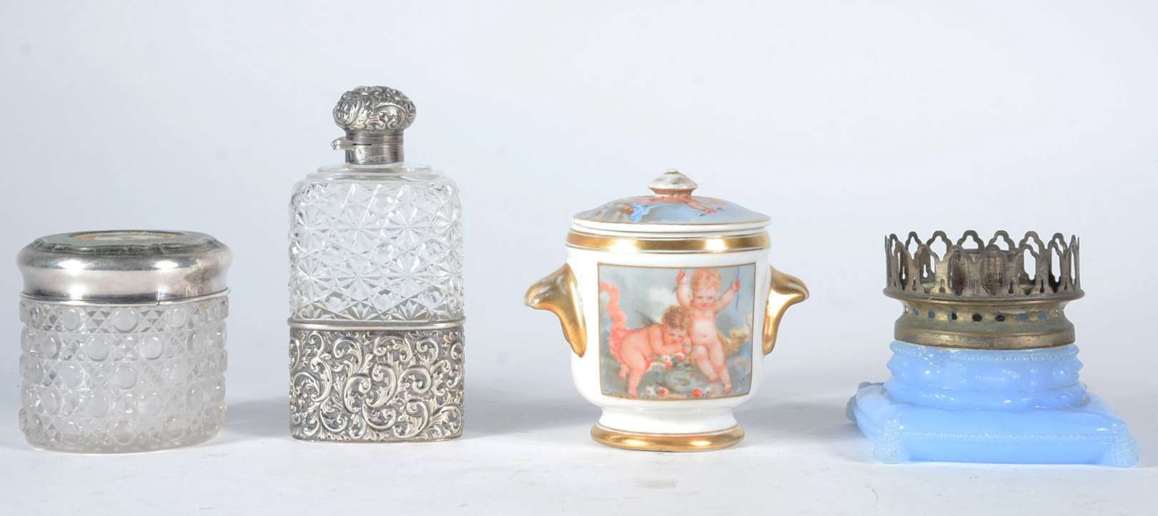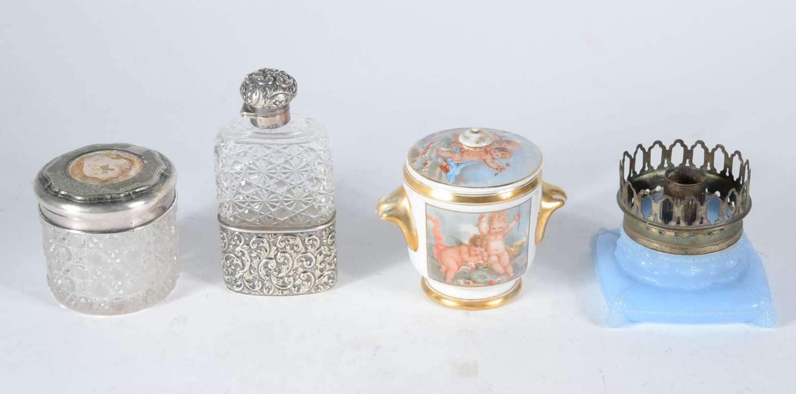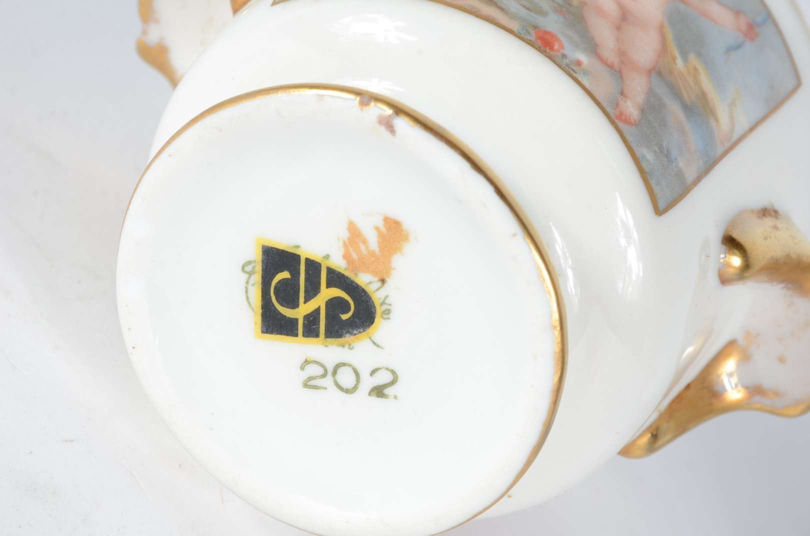 Sete peças de porcelana de diversas procedências, sendo par de perfumeiros e poseira com flores em policromia e friso...