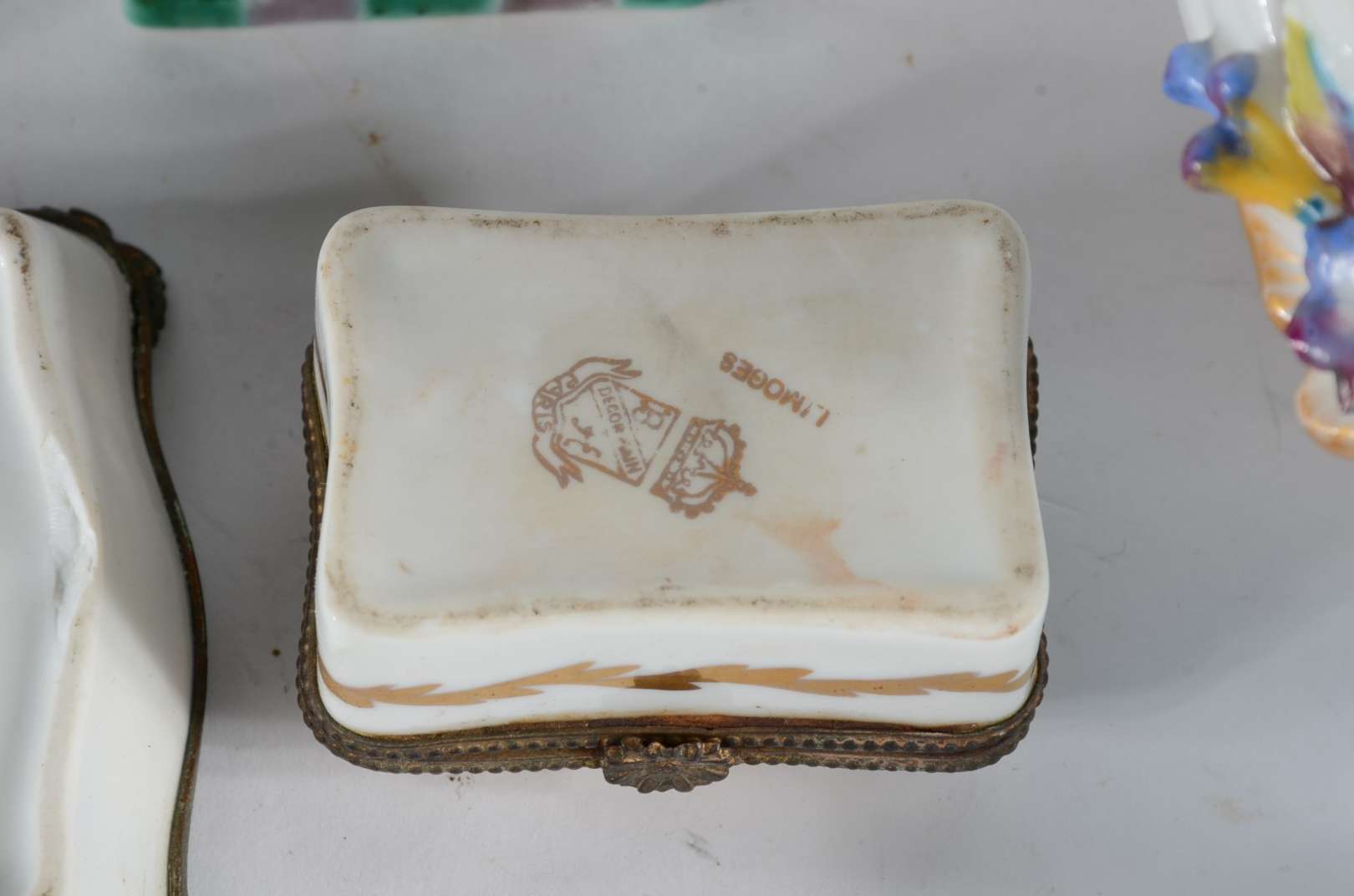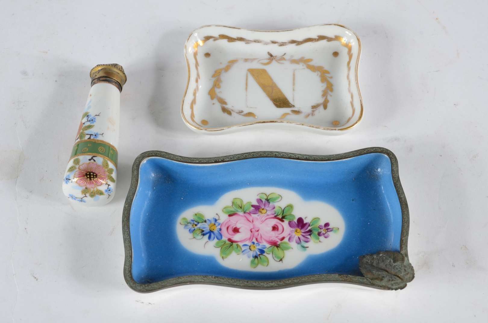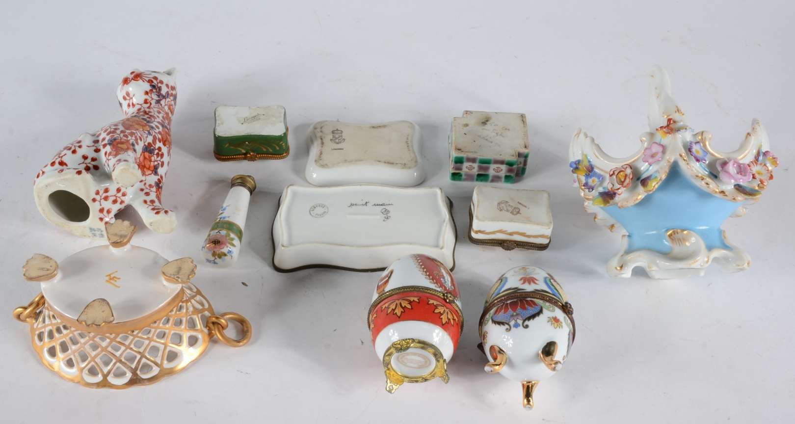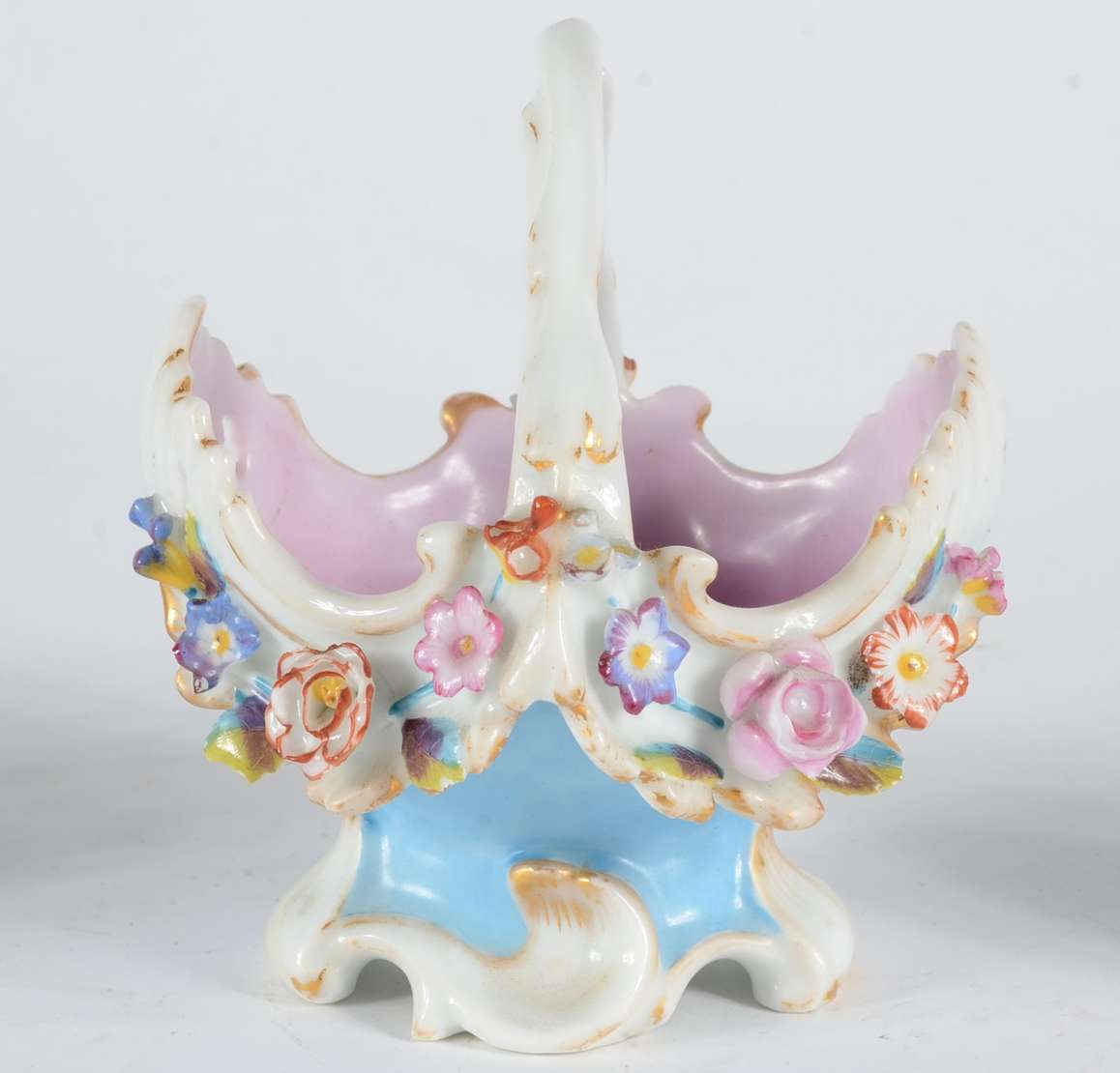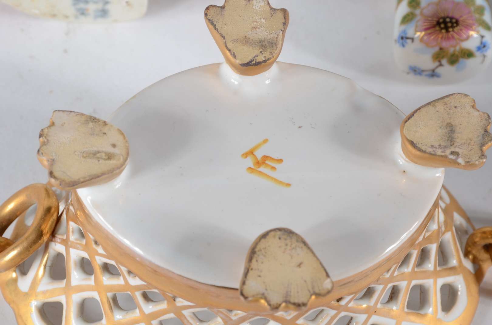 Sete peças de porcelana de diversas procedências, sendo par de perfumeiros e poseira com flores em policromia e friso...