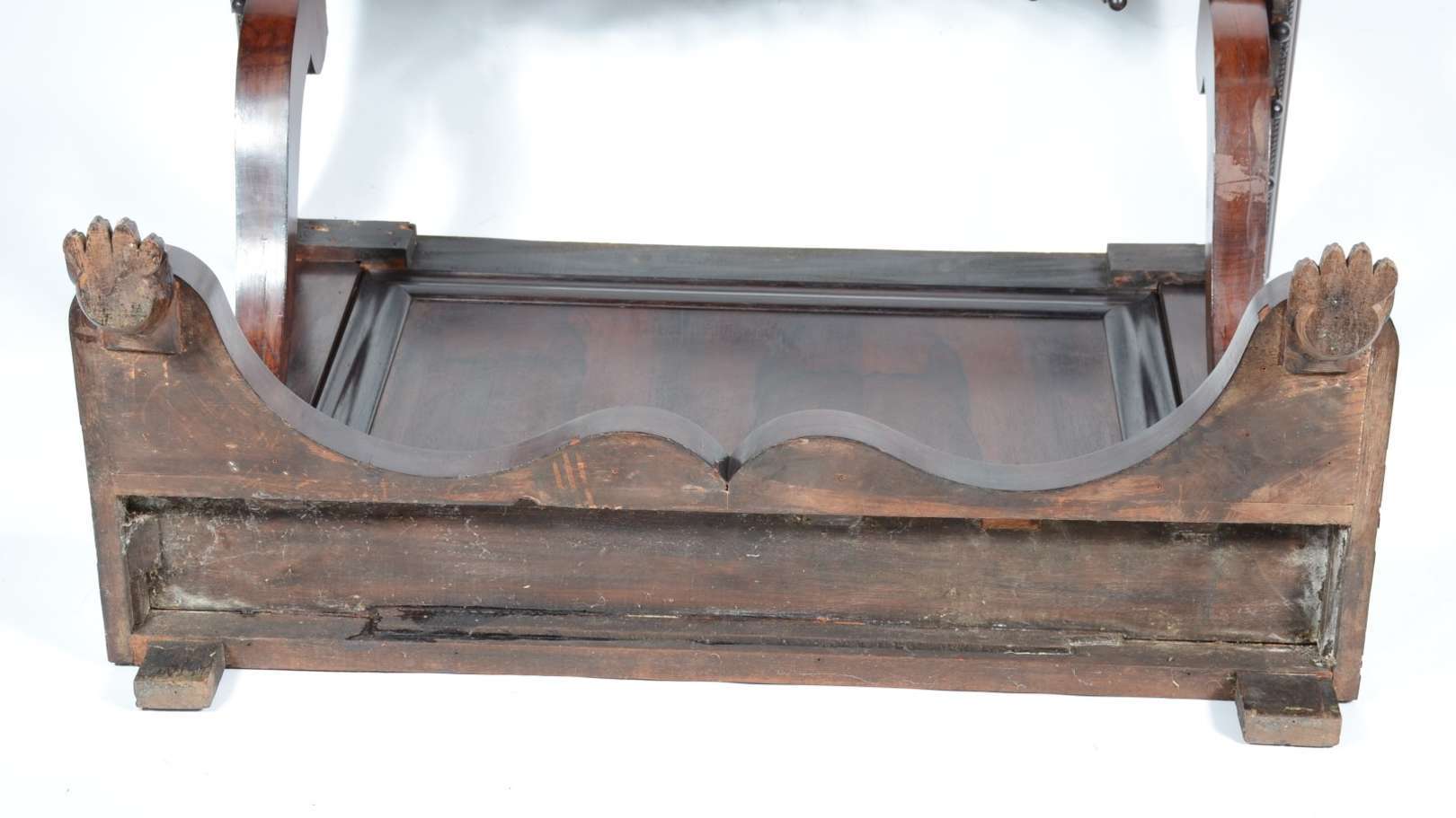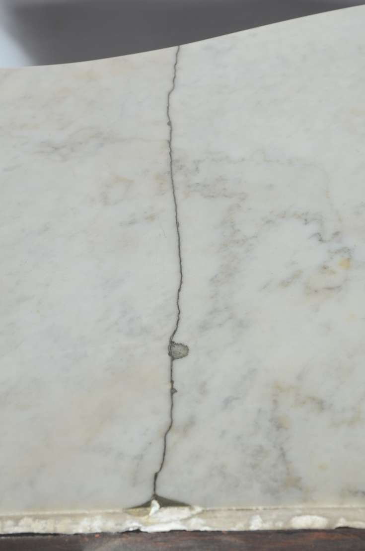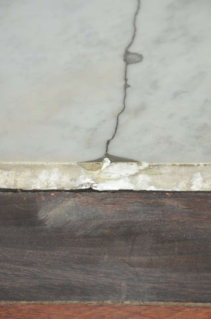 Pequena mesa auxiliar de madeira nobre, tampo de mármore. Faltando a gaveta.