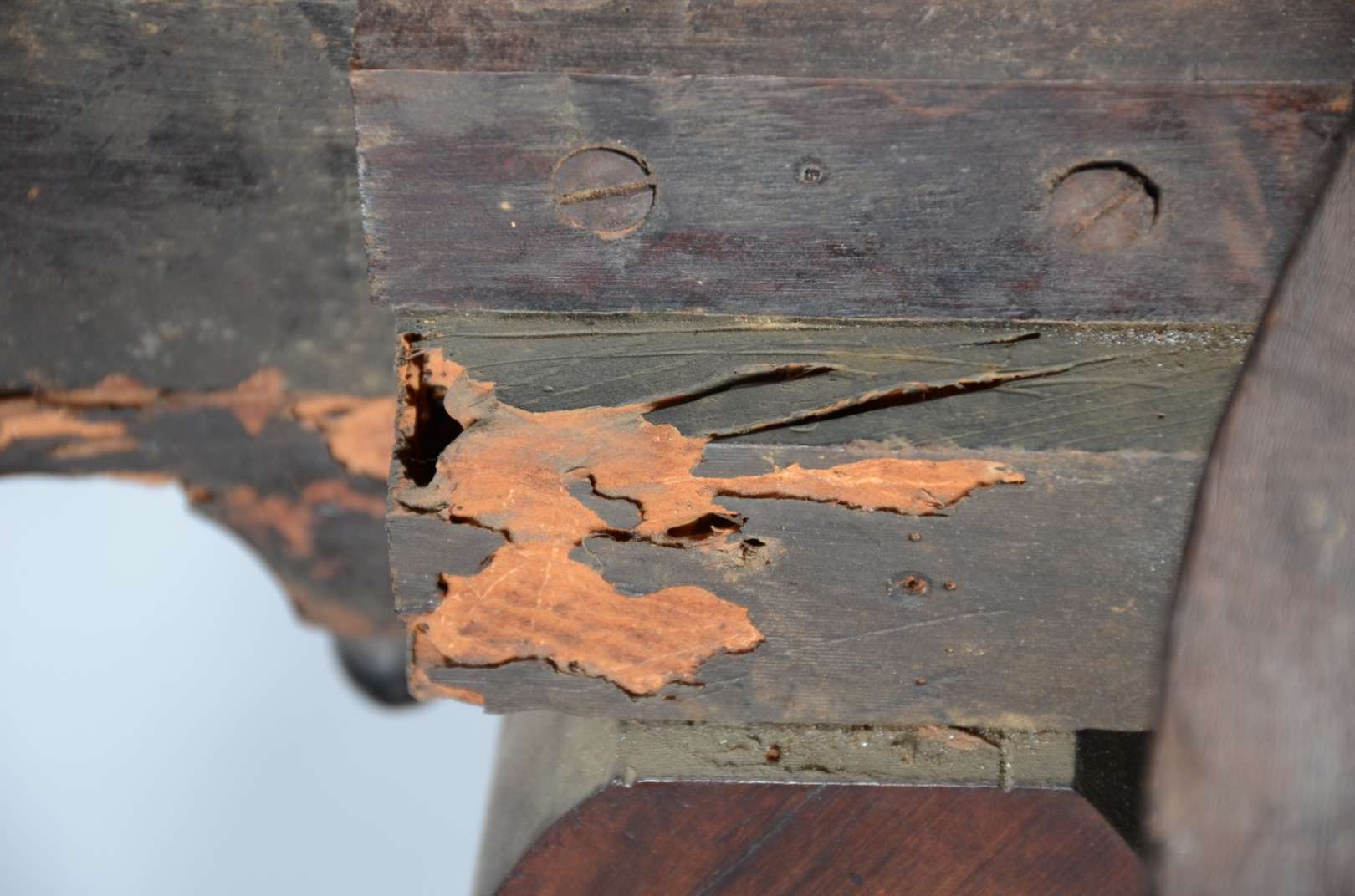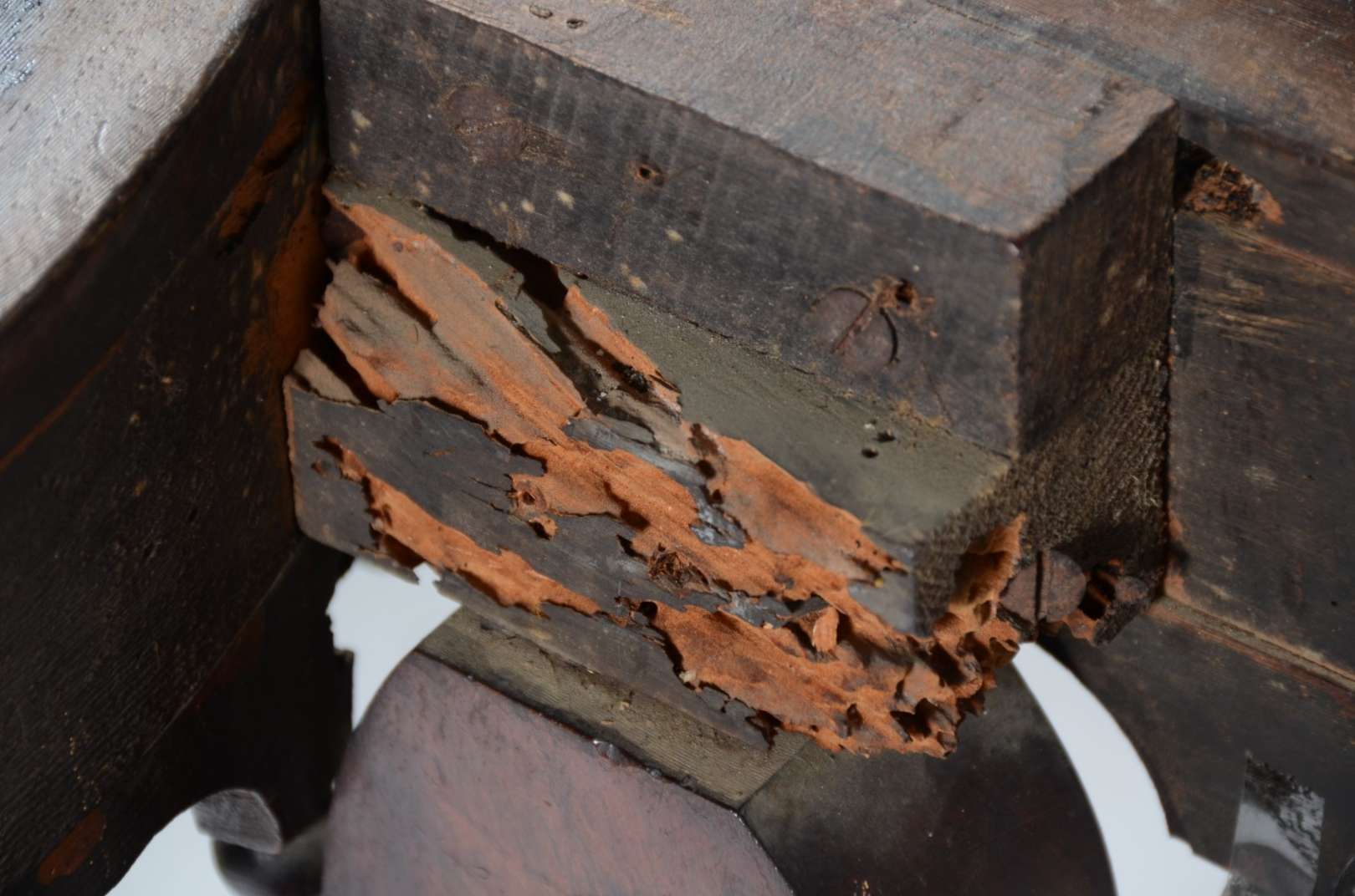 Cômoda de madeira com 3 gavetões e duas gavetas, cantos arrematados por "leques". Entradas de chaves de osso. Já teve...