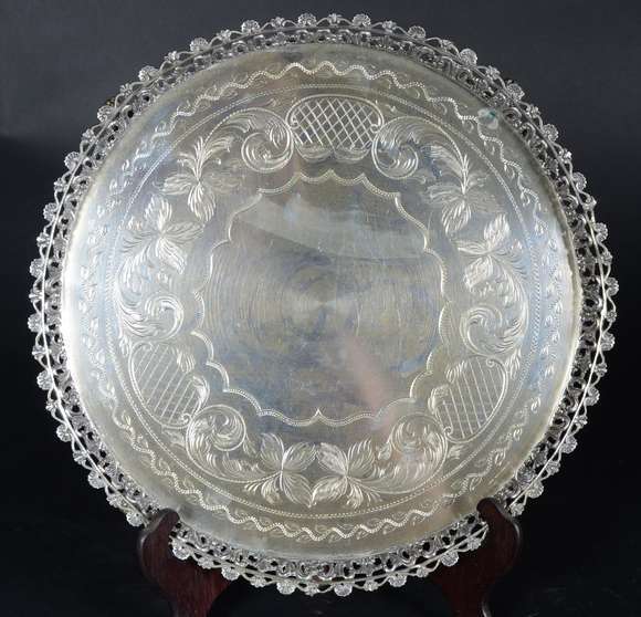 Salva de prata, fundo cinzelado com galeria vazada com pés de garra, contraste 833 mls, prateiro Alves Pinto. Peso da...