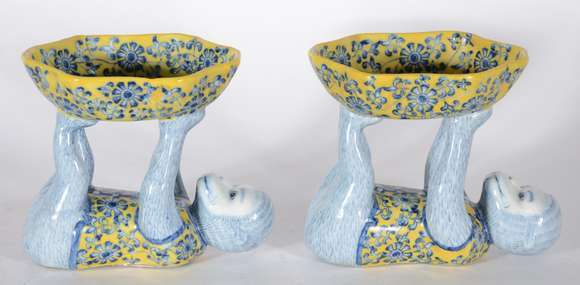 Par de fruteiras de porcelana chinesa policromada representando "macaquinhos" sustentando bowls.