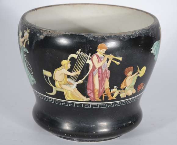 Cachepot de porcelana inglesa preta com figuras de musicistas em policromia. Desgastes.