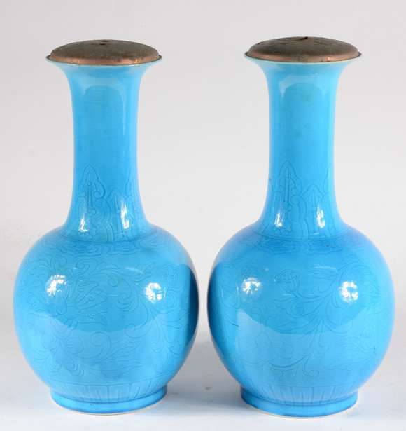 Par de vasos de porcelana chinesa azul turquesa, marcas na base. Bocais fechados com metal.