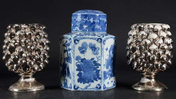 Três peças diversas, sendo: par de vasos italianos de cerâmica com resquícios de pátina prateada de Christian Dior; e...