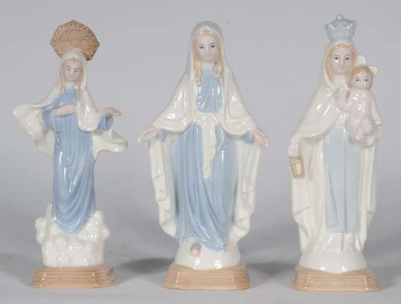 Três esculturas de porcelana policromada representando Virgem Maria.