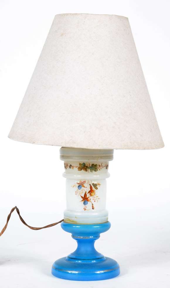 Abatjour de opalina branca e azul com flores em policromia, acompanha cúpula na cor bege.