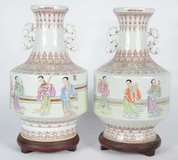 Par de vasos balaústres em porcelana chinesa, decorados em sépia por numerosos frisos com estilizações variadas, cent...