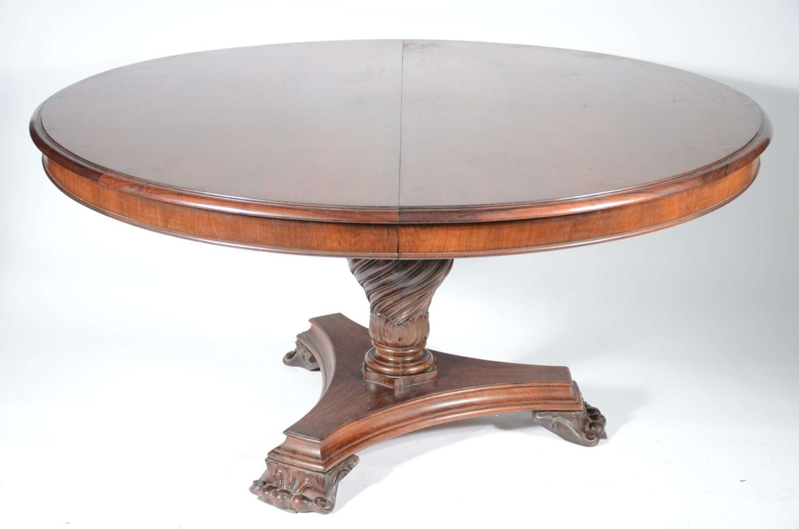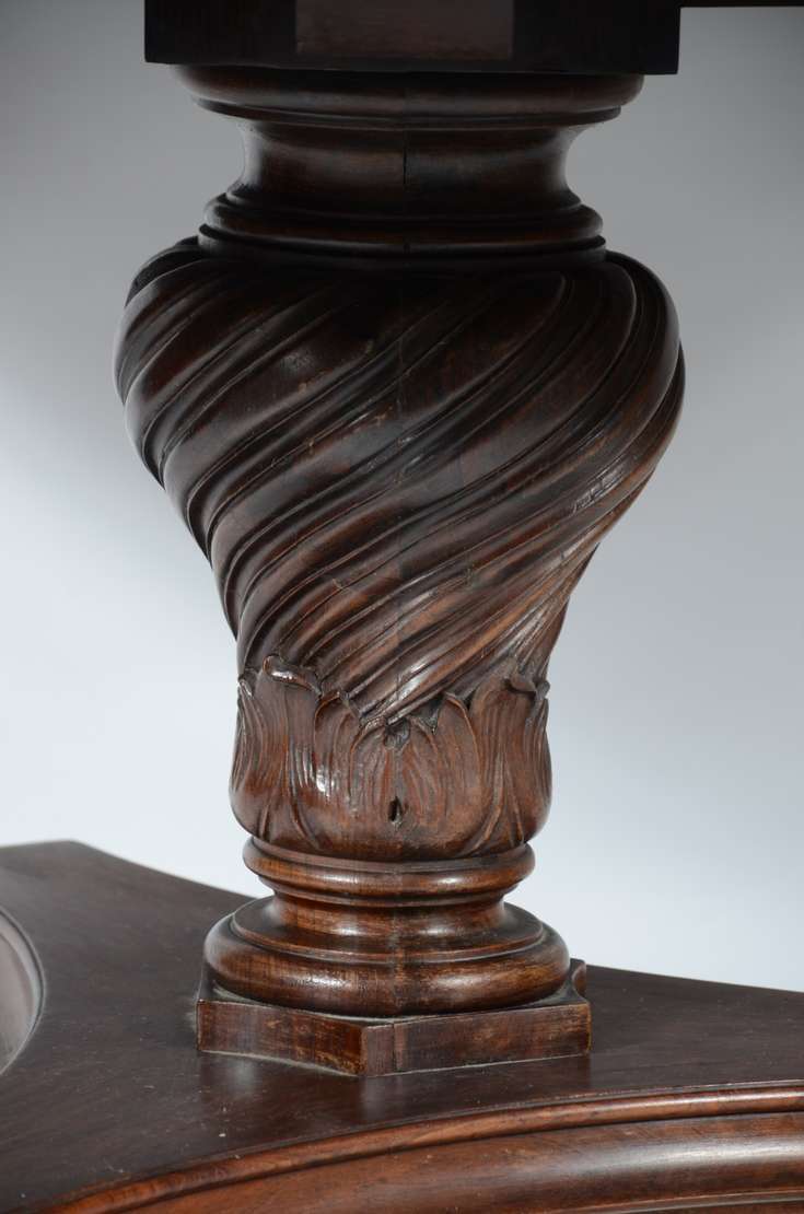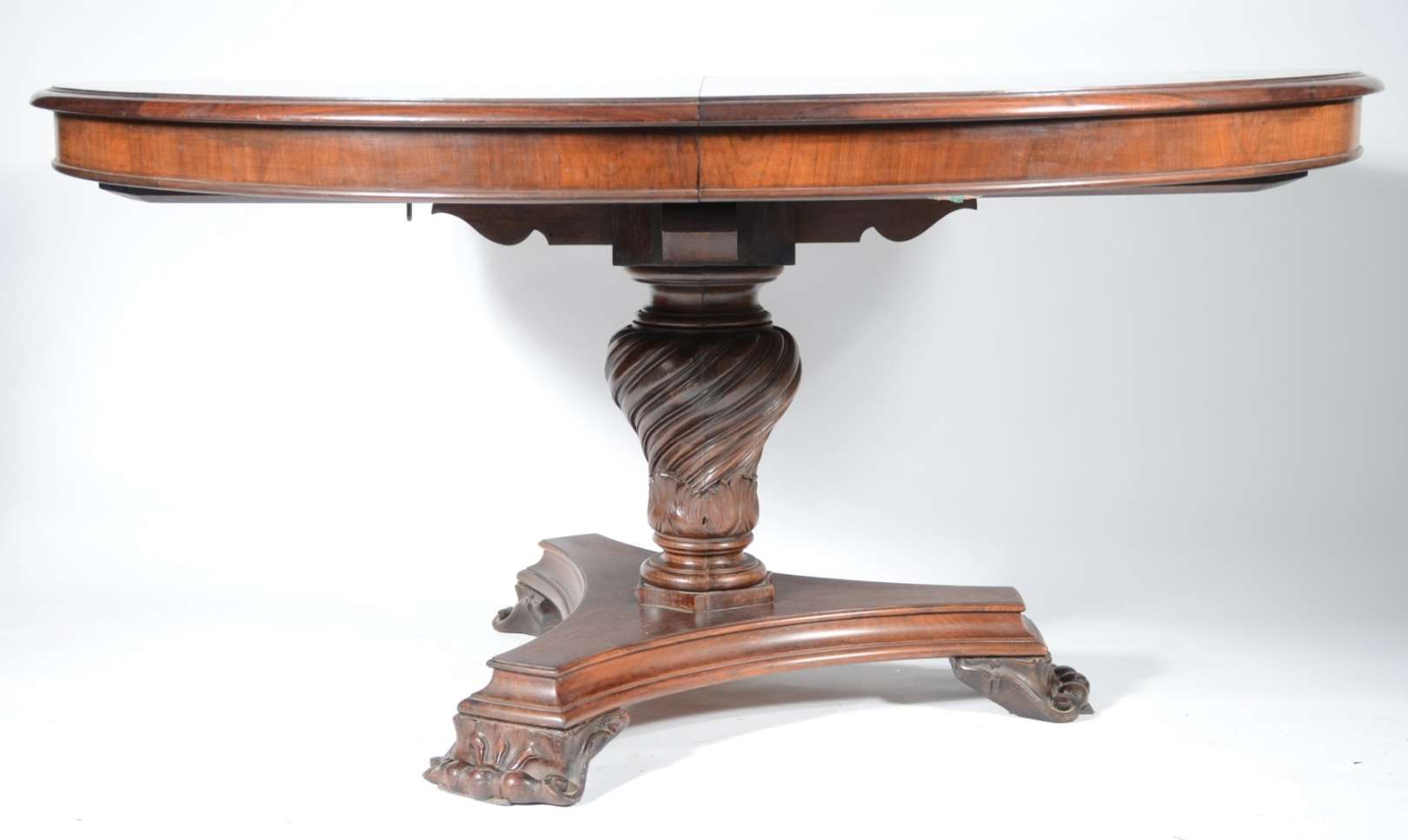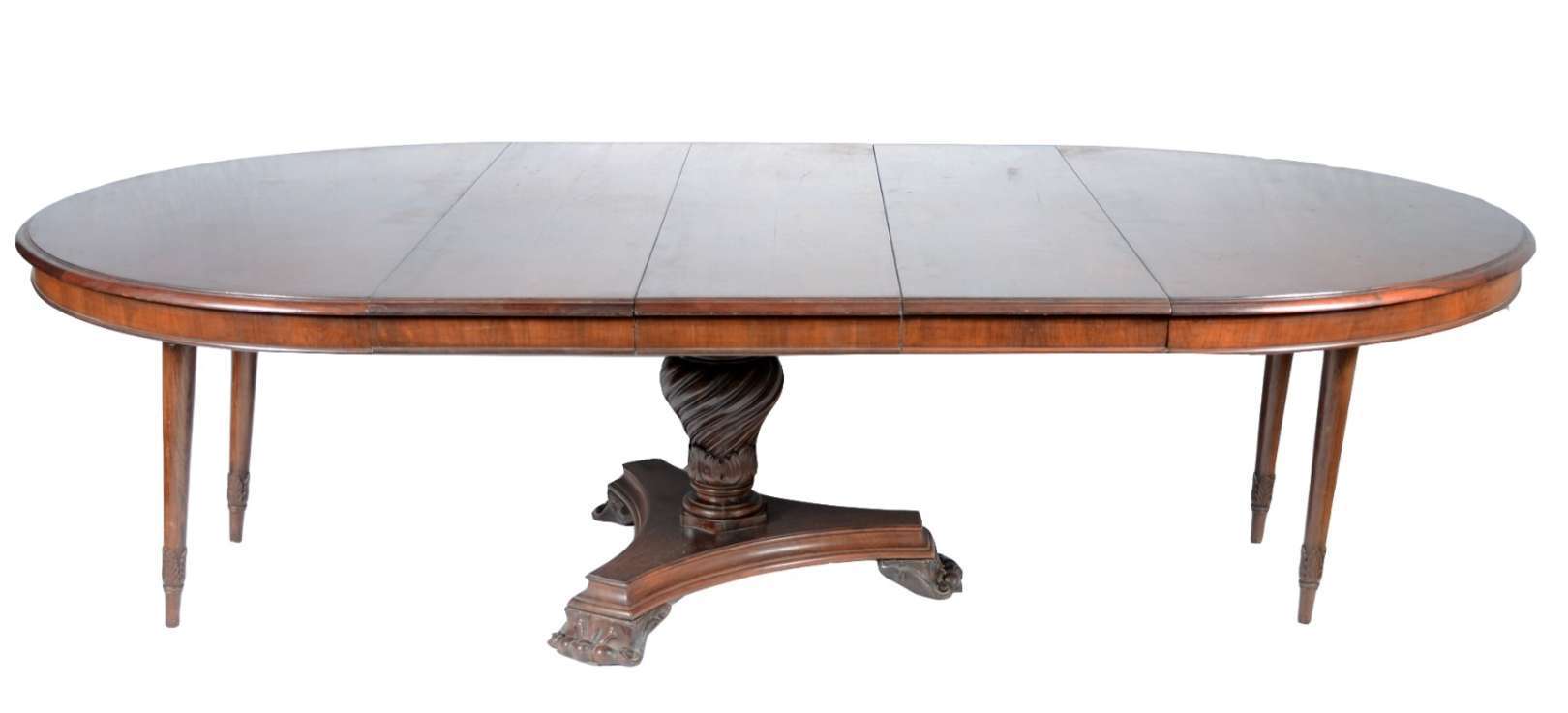 Mesa oval de madeira nobre, apoio em coluna central com trabalhos gomados na base.