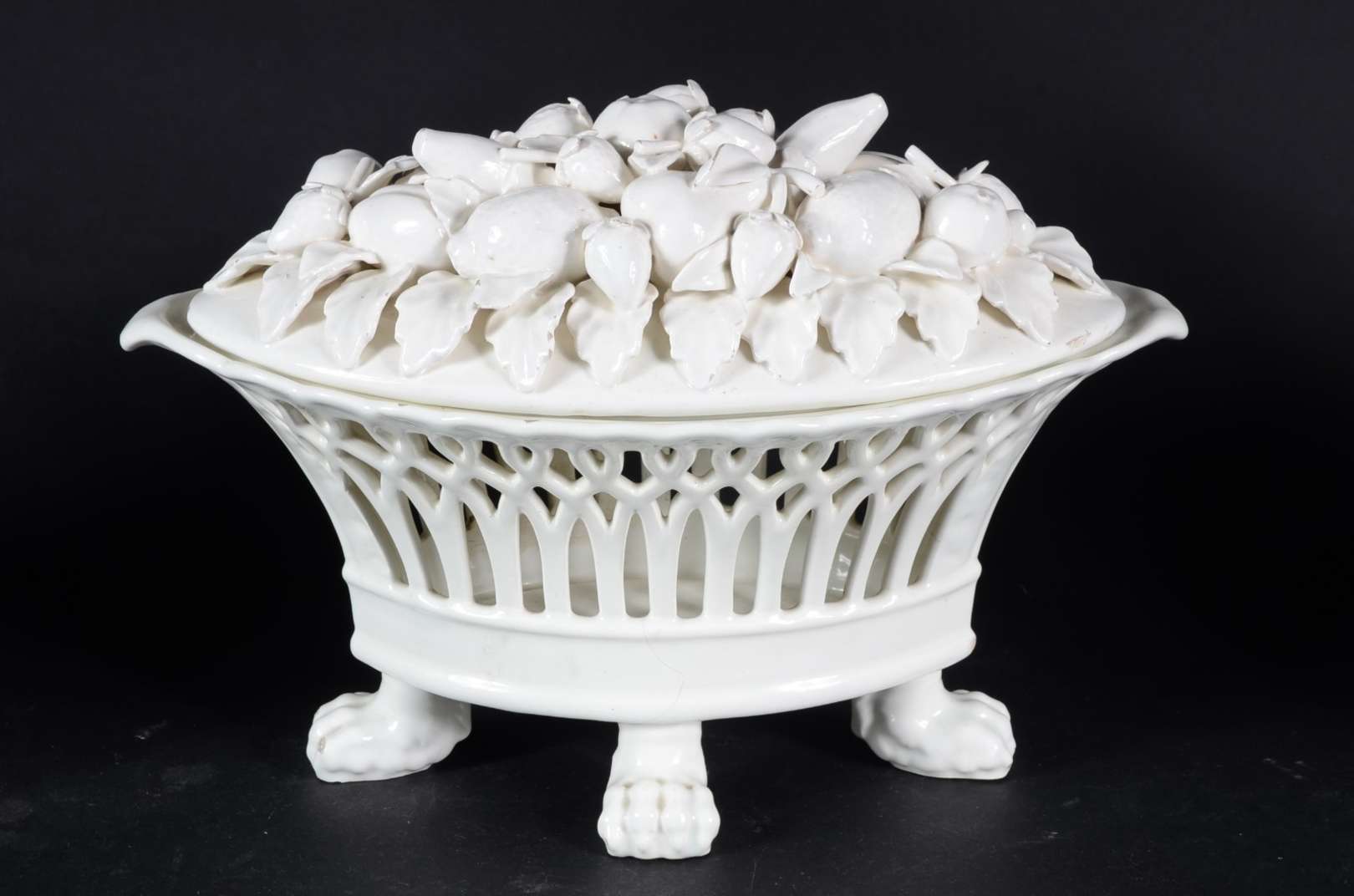 Belíssimo centro de mesa de porcelana alemã de Berlim, ricamente decorada com cenas de tabernas e arranjos florais em...