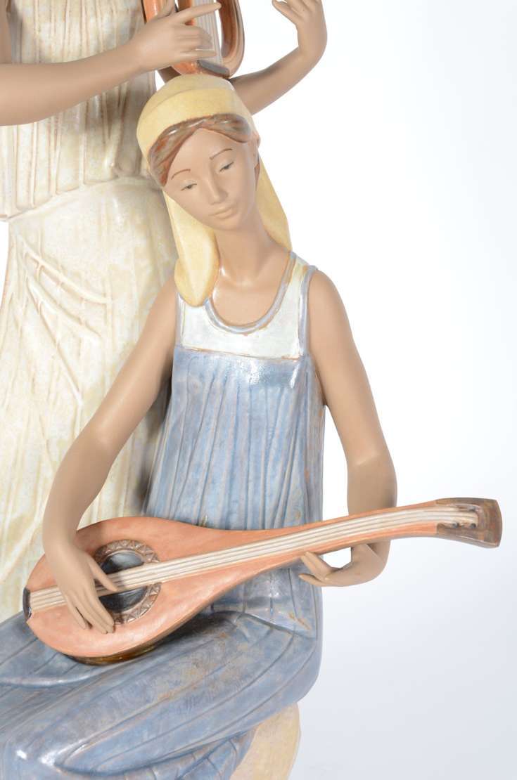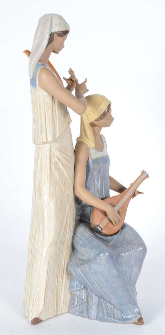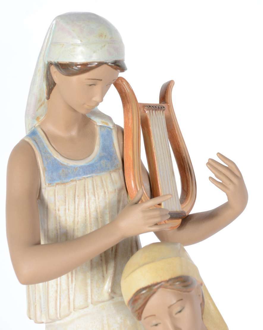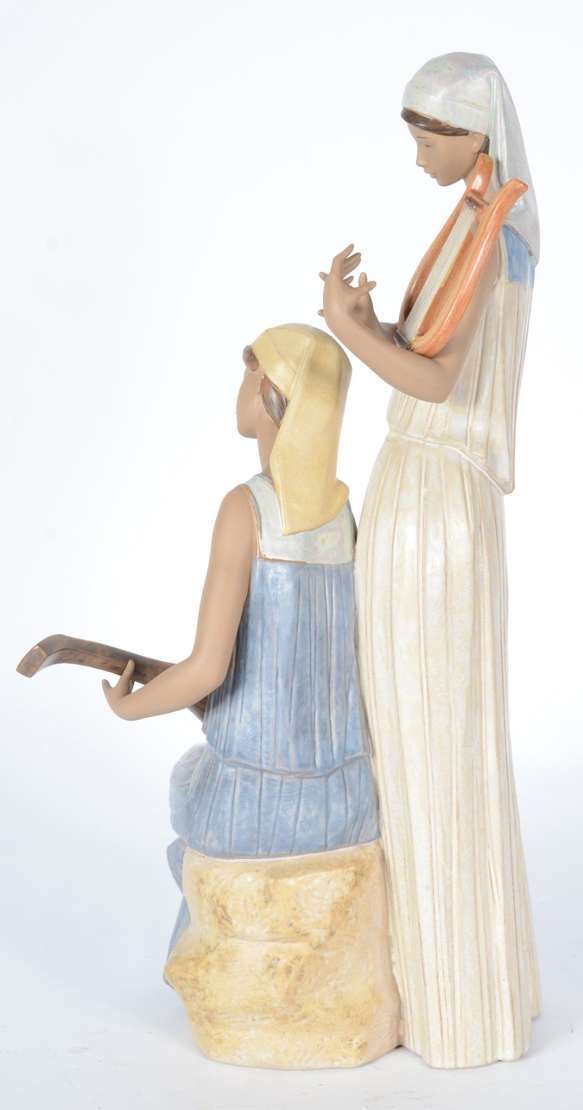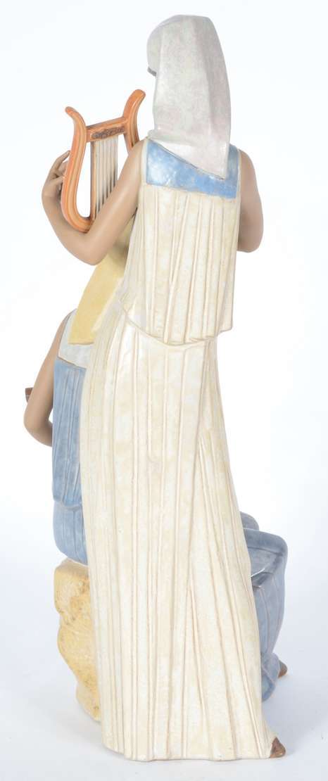 Estatueta de marfim com policromia representando duas figuras, uma delas com cajado.