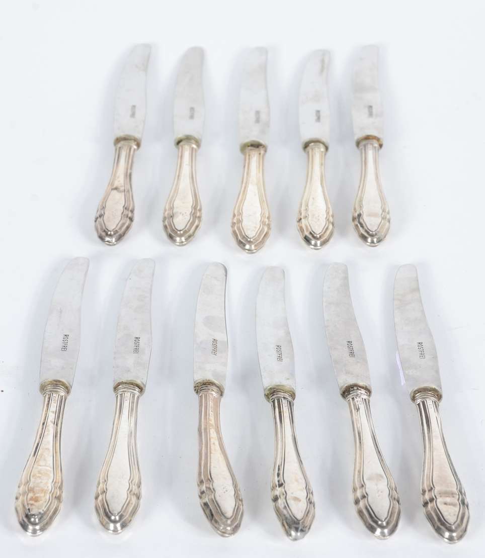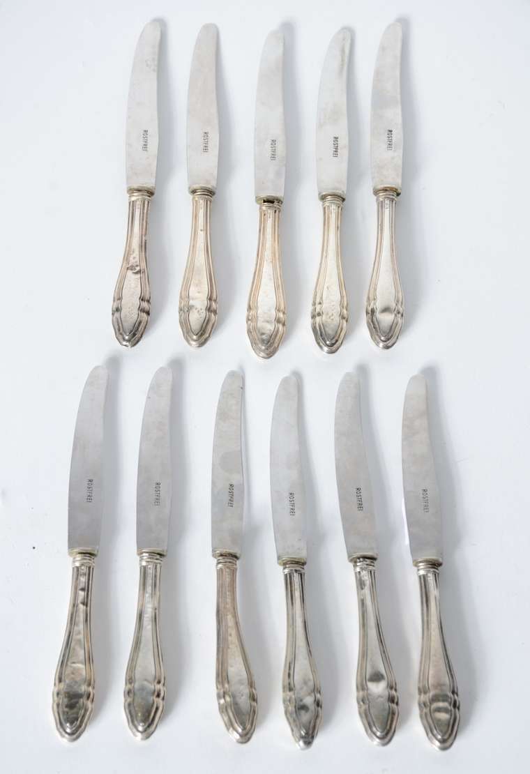 Faqueiro de metal prateado Eberle, composto de: 16 facas, 12 colheres, 11 garfos grandes; 14 facas, 10 colheres, 11 g...