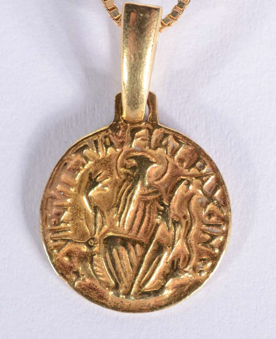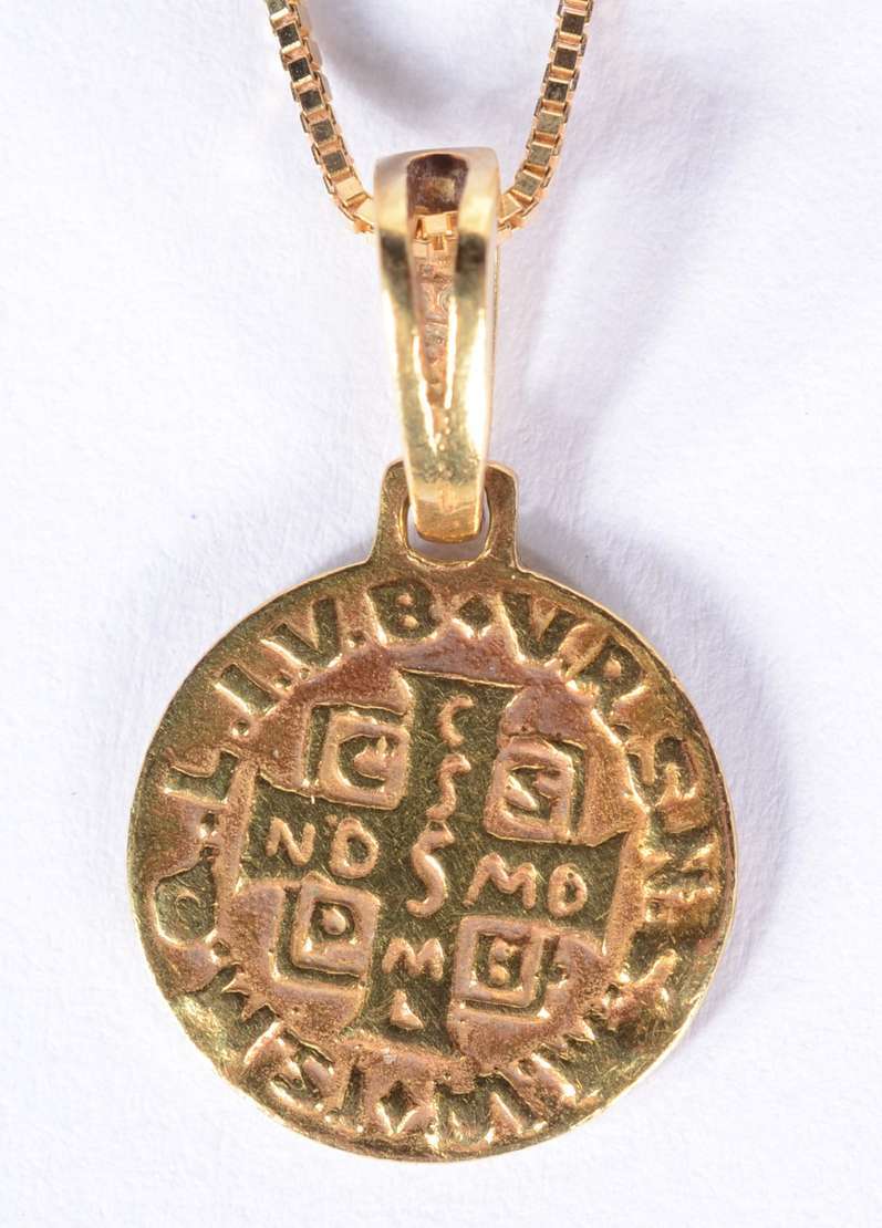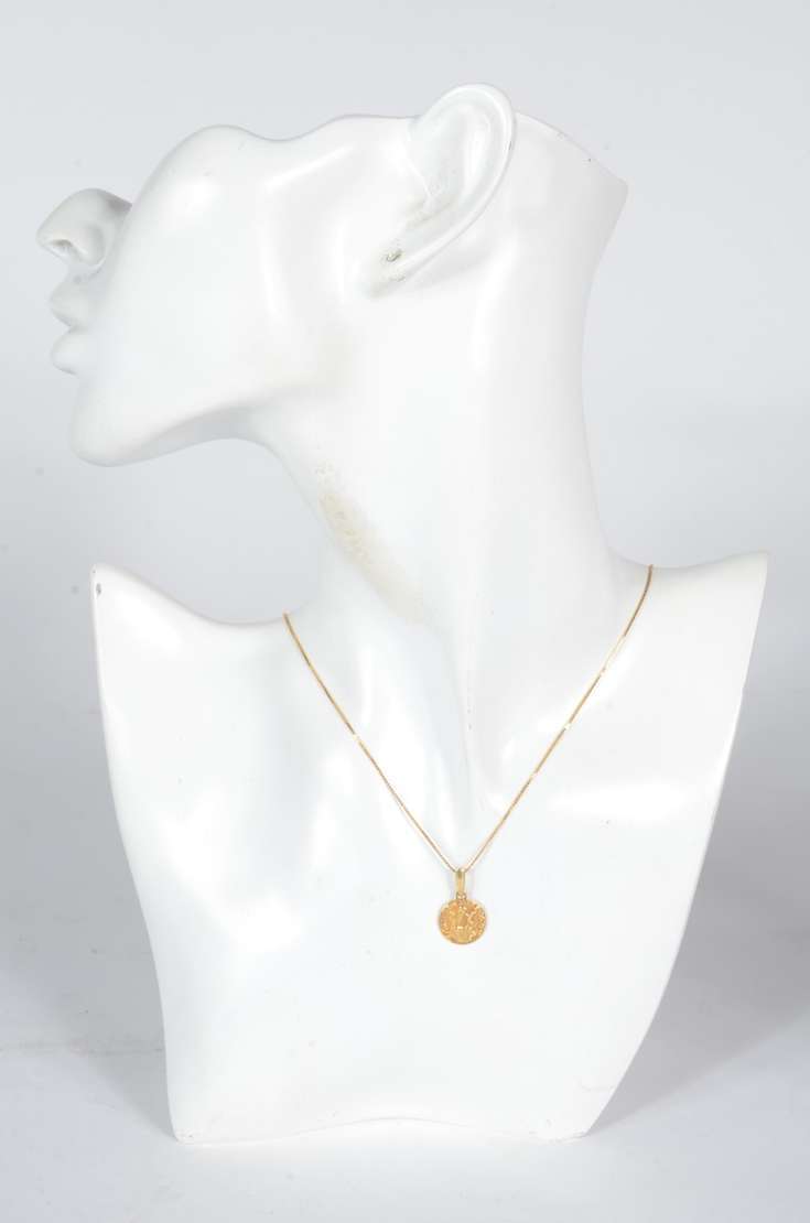 Colar de ouro 18 k., contraste 750 mls com pendente sacro. (Por motivos de segurança a peça não se encontra na loja).