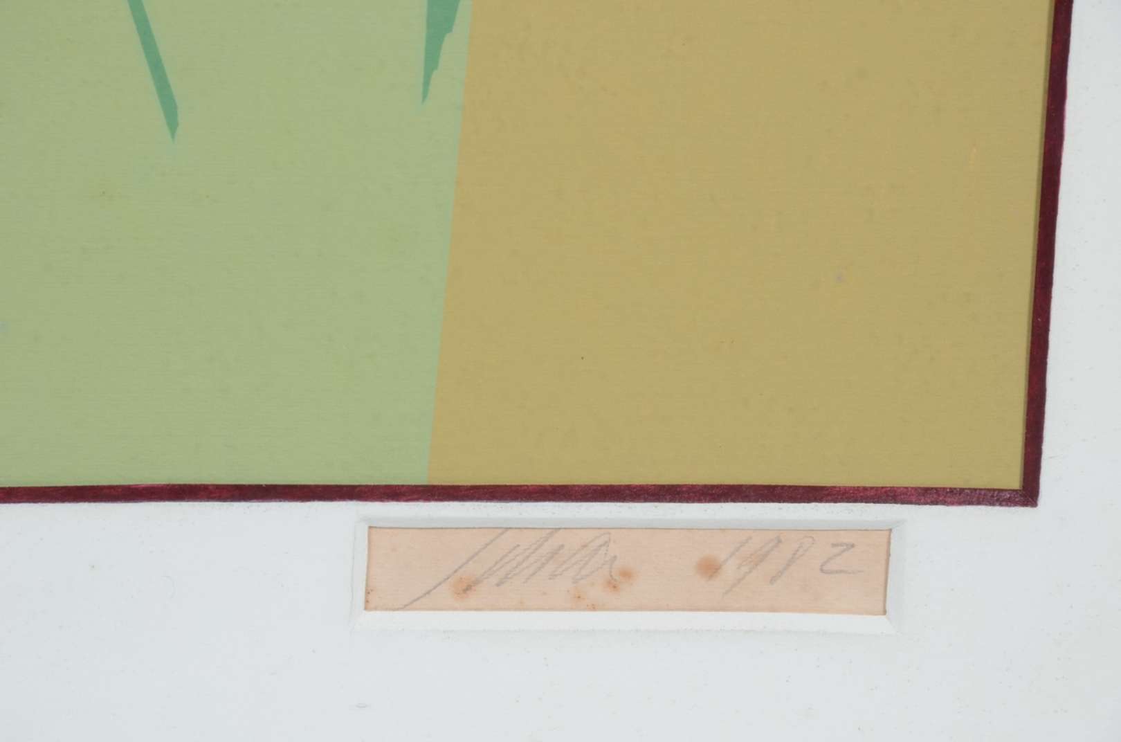 Vinil e colagem encerados sobre tela. Selo da Galeria Contorno (RJ) no verso. Datado e localizado Cabo Frio, 1992.