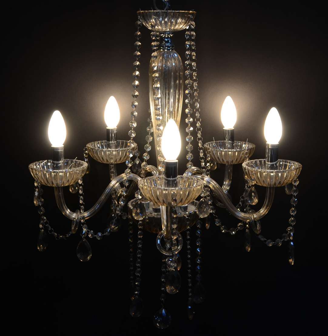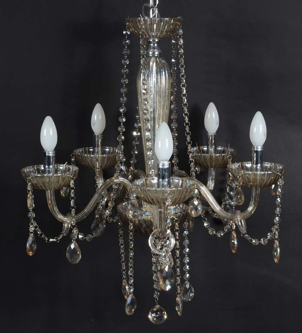 Lustre de metal dourado trabalhado em relevo, para 6 luzes, mangas de cristal fosco lapidado.