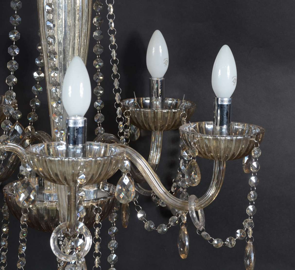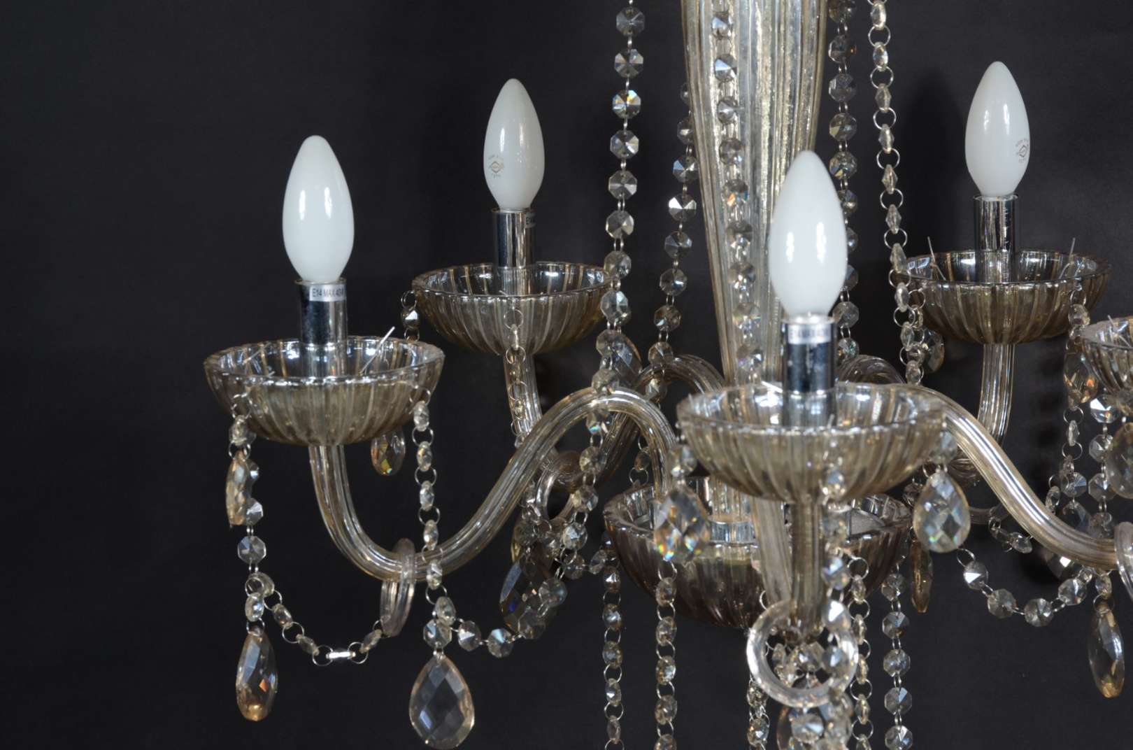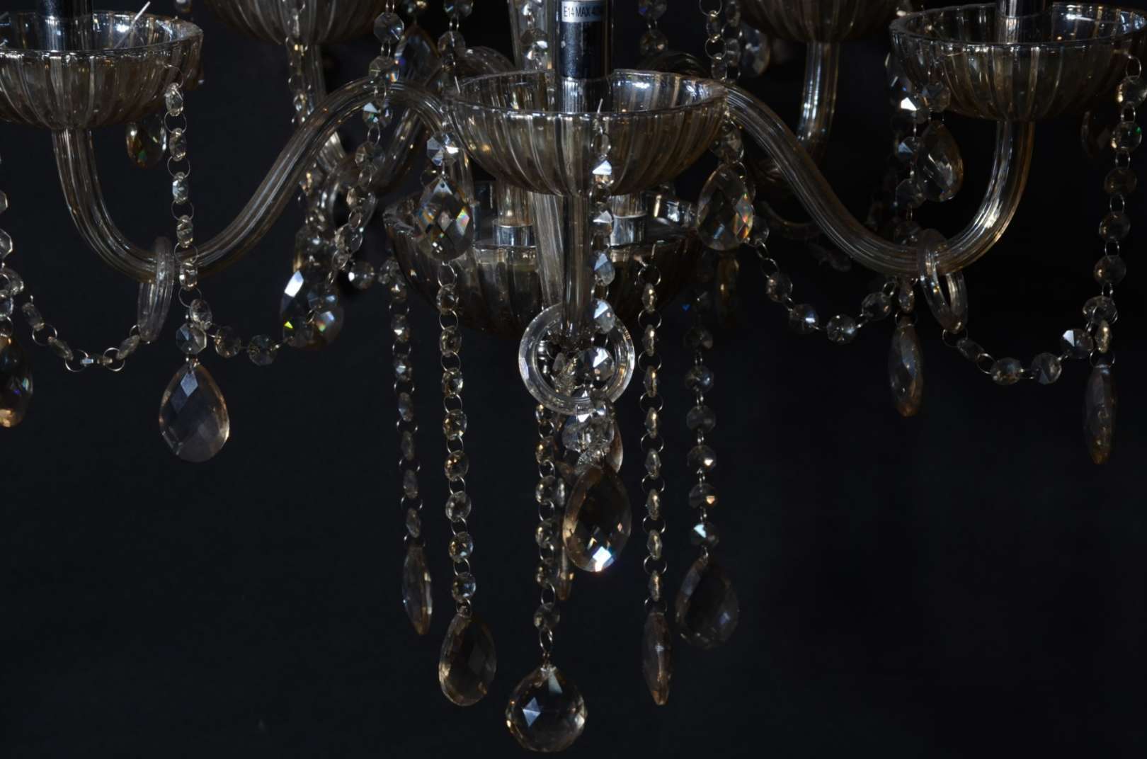 Lustre de metal pintado para 8 luzes com pingentes de cristal lapidado e pequenas cúpulas "animal print".
