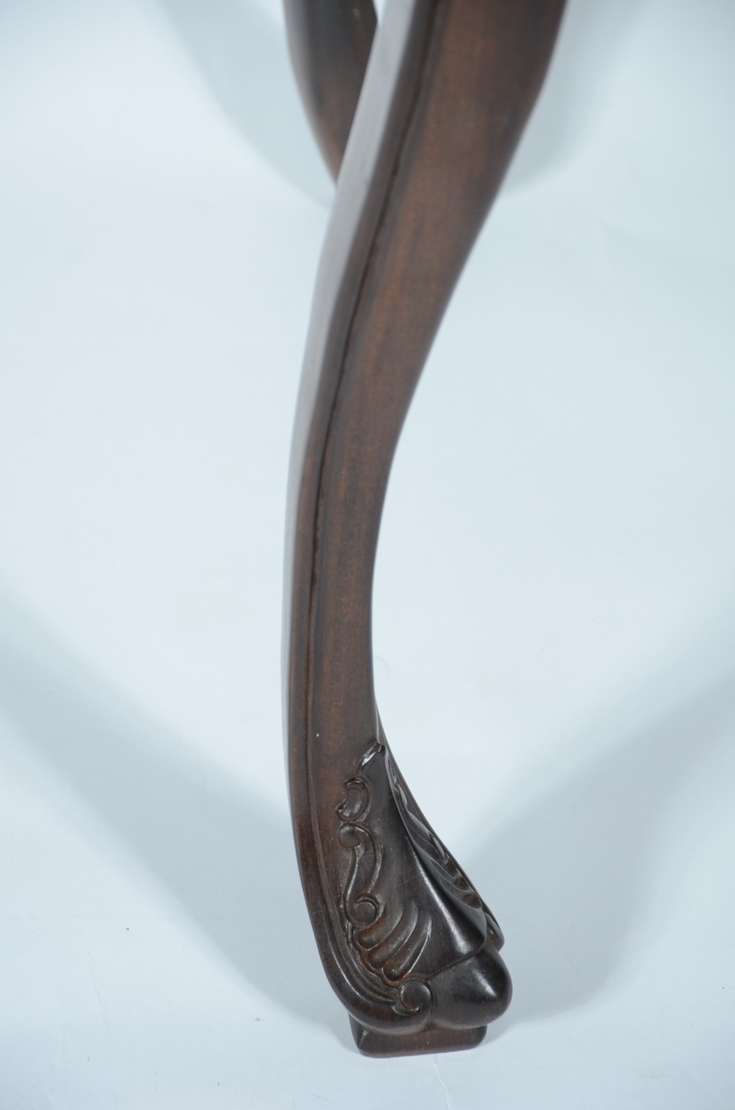 Mesa auxiliar de madeira ebanizada, estilo oriental, tampo redondo, saia com hastes arredondadas e vazadas, quatro pe...