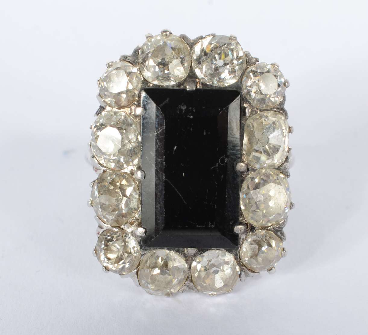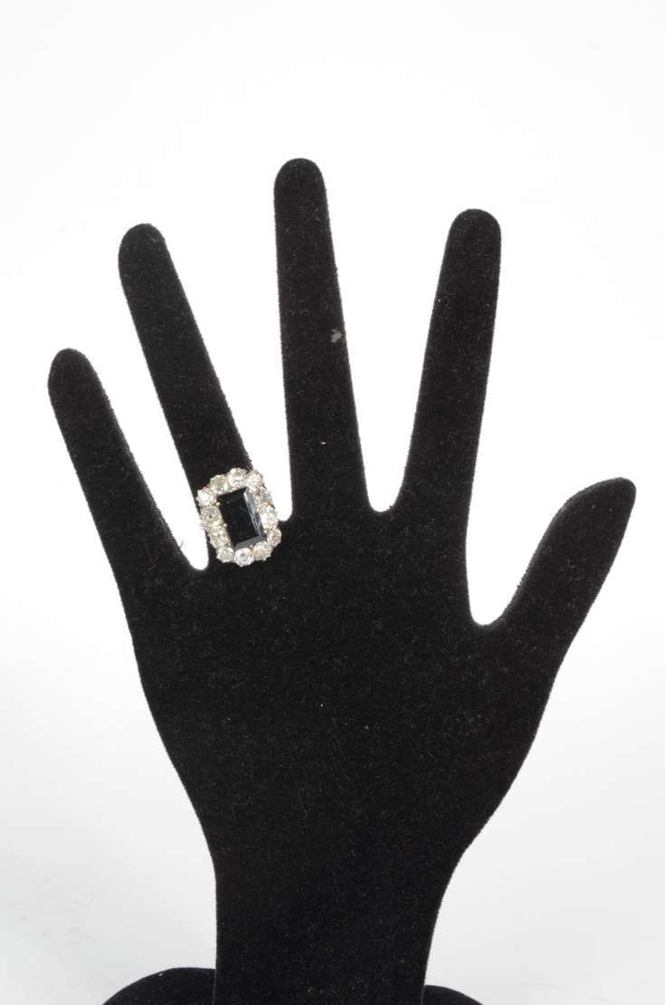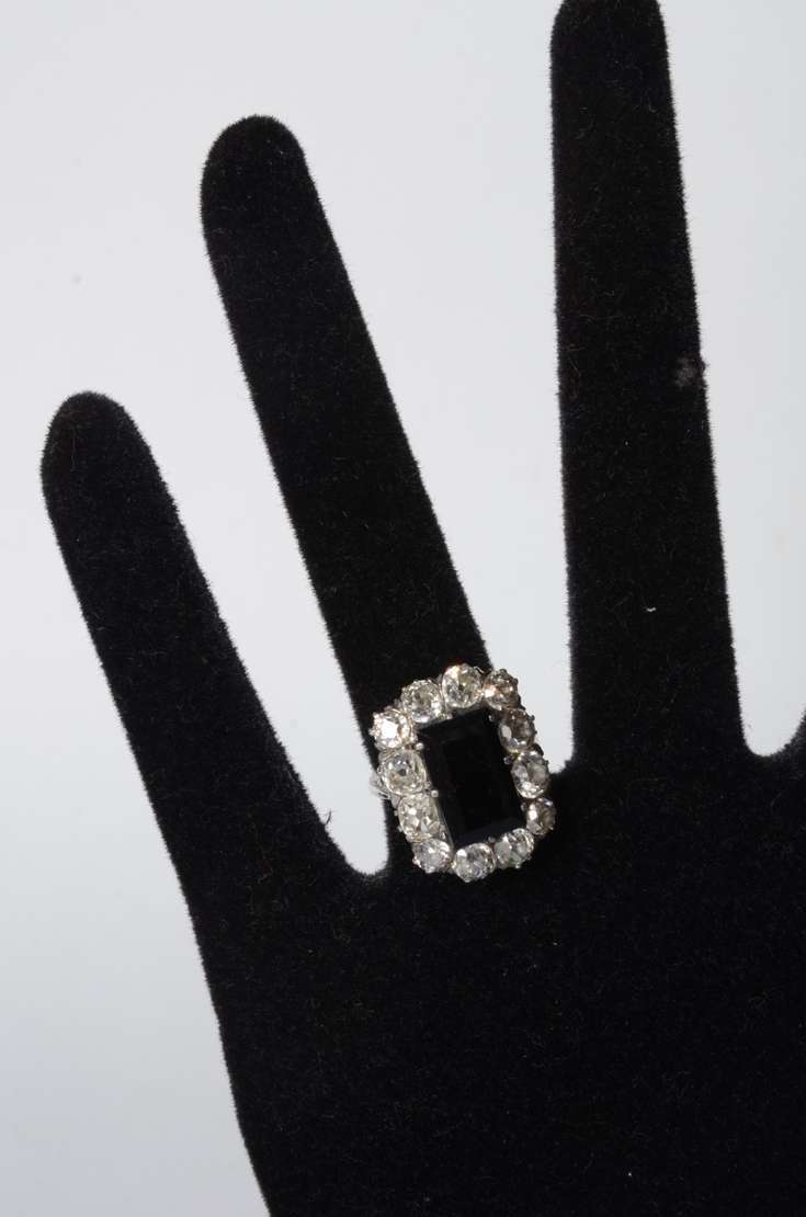 Anel de ouro 18 k., três brilhantes em cada lado e pedra central oval na cor vermelha. Aro 16. (Por motivos de segura...