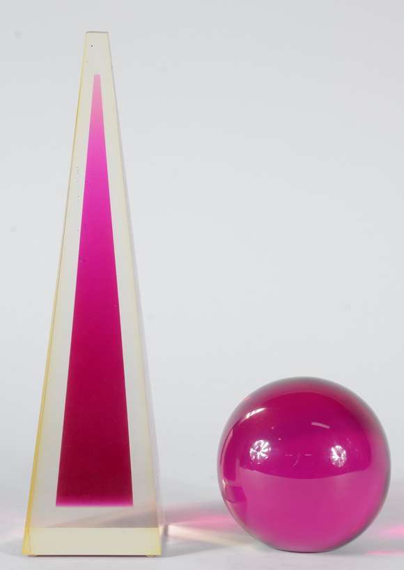 Duas peças decorativas de resina de poliéster rosa, sendo um obelisco (prisma) e uma bola.
