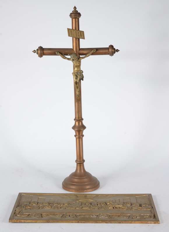Duas peças sacras, sendo: santa ceia e crucifixo com figura de Cristo de bronze.