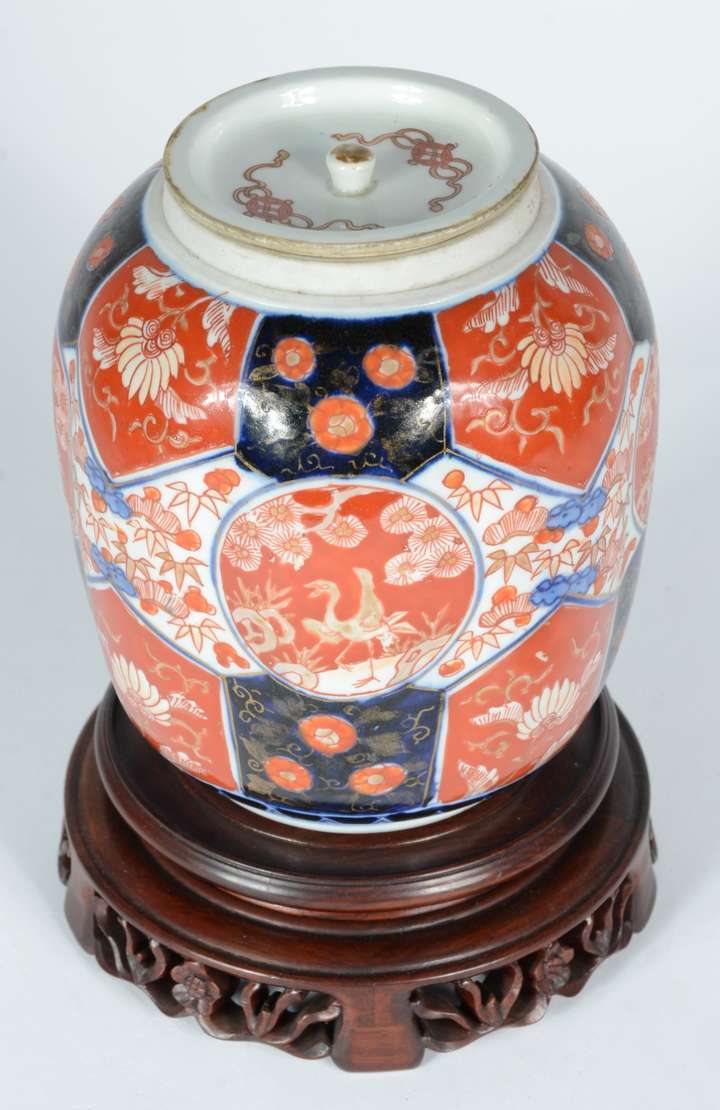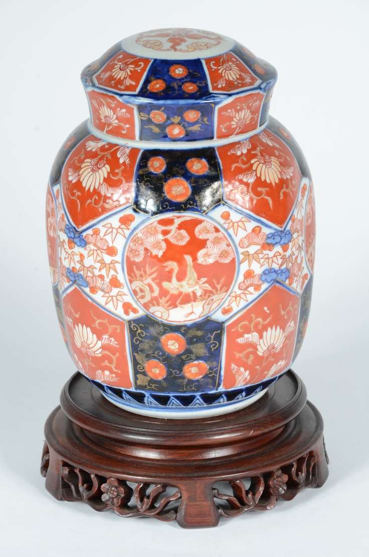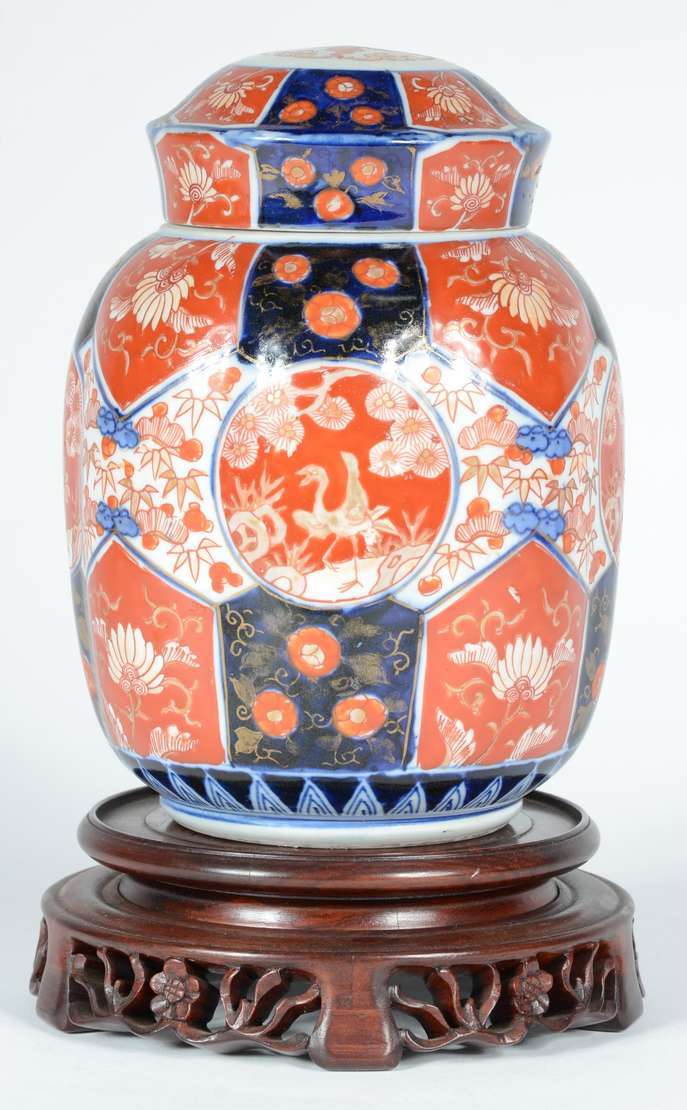 Potiche de cerâmica decorado com flores em azul e branco.