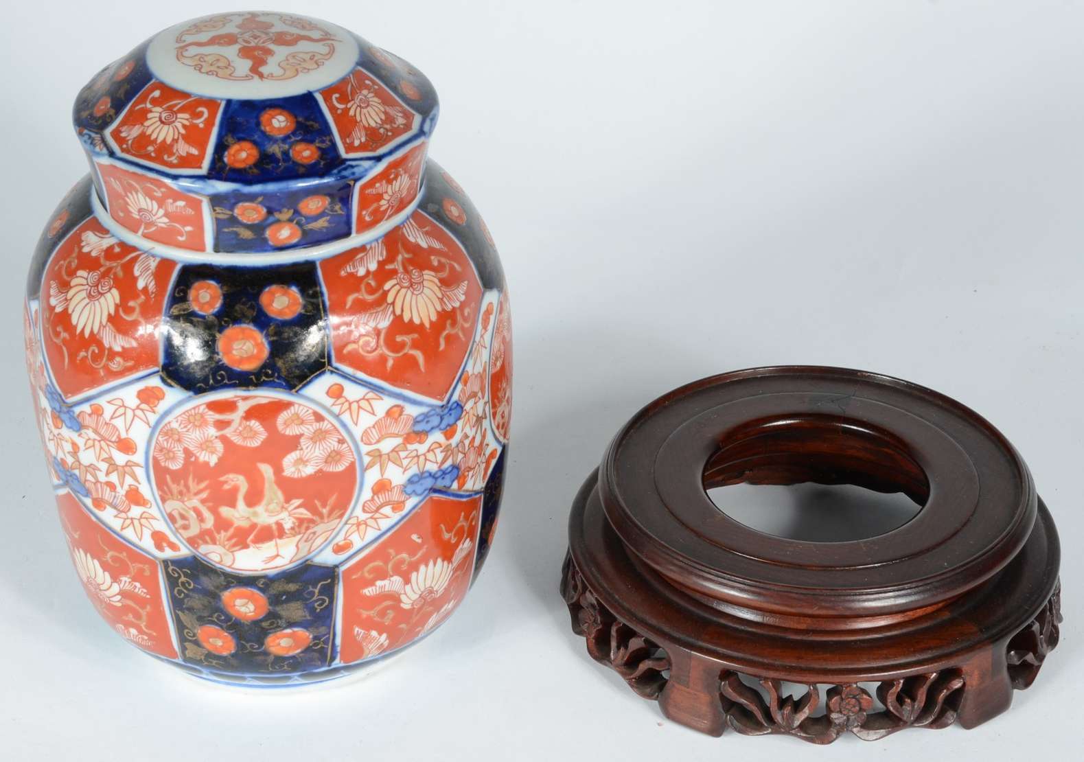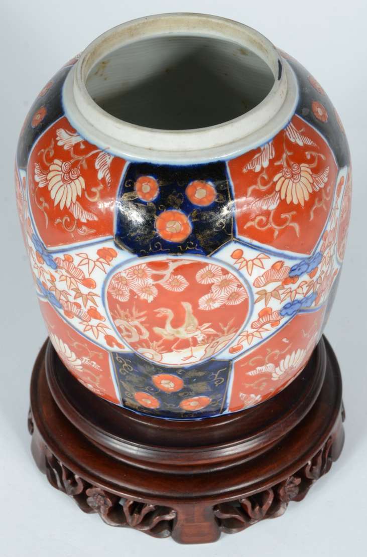 Três vasos de porcelana oriental azul e branco, bases de madeira.