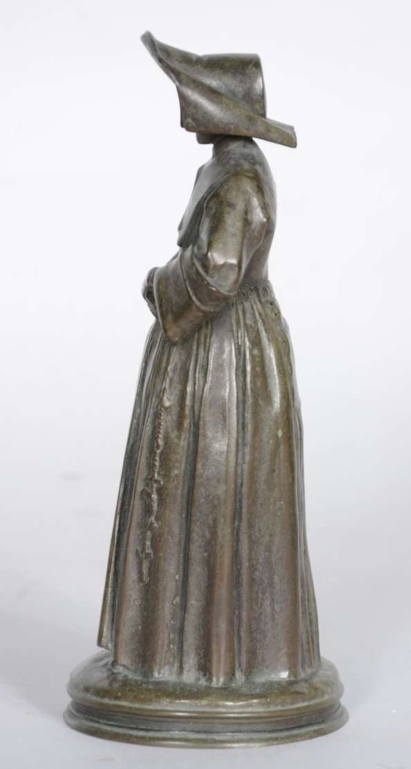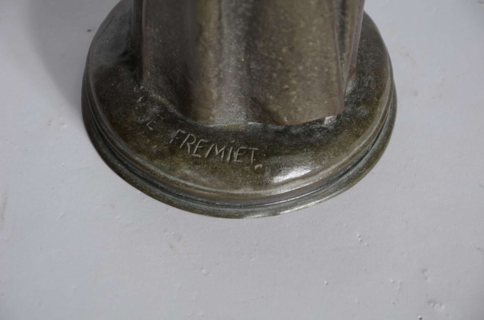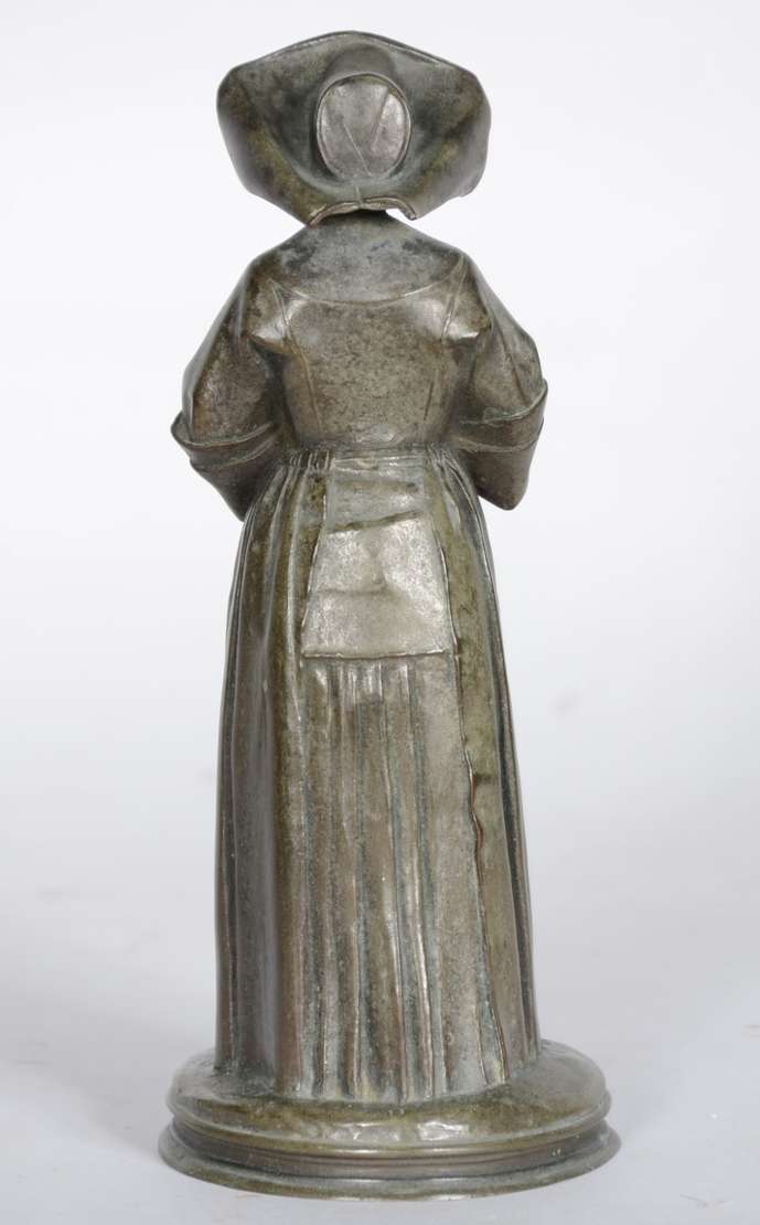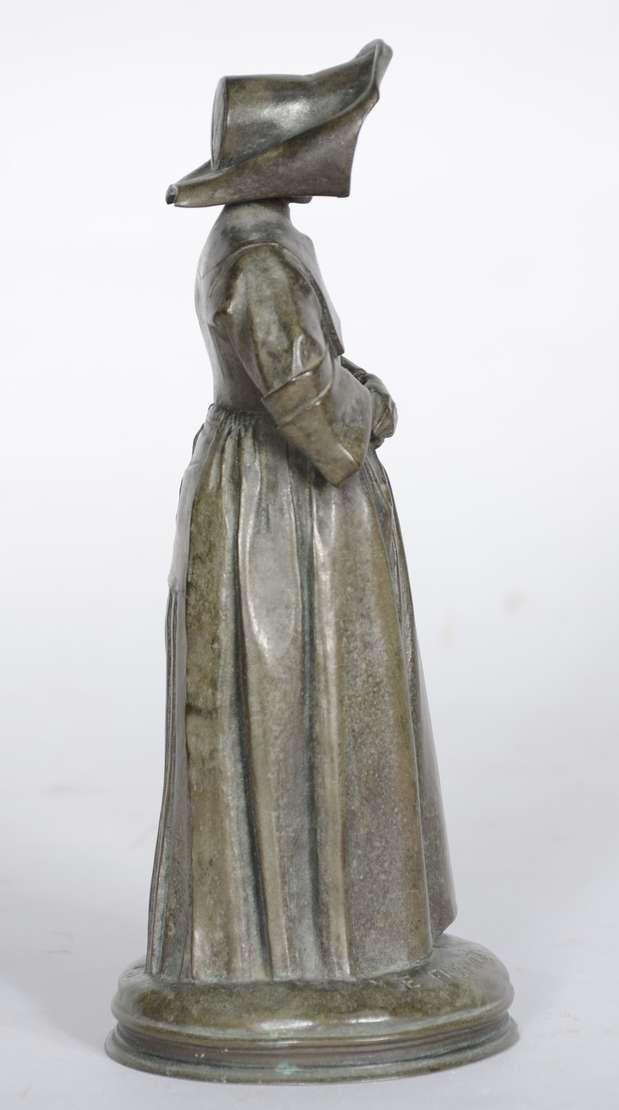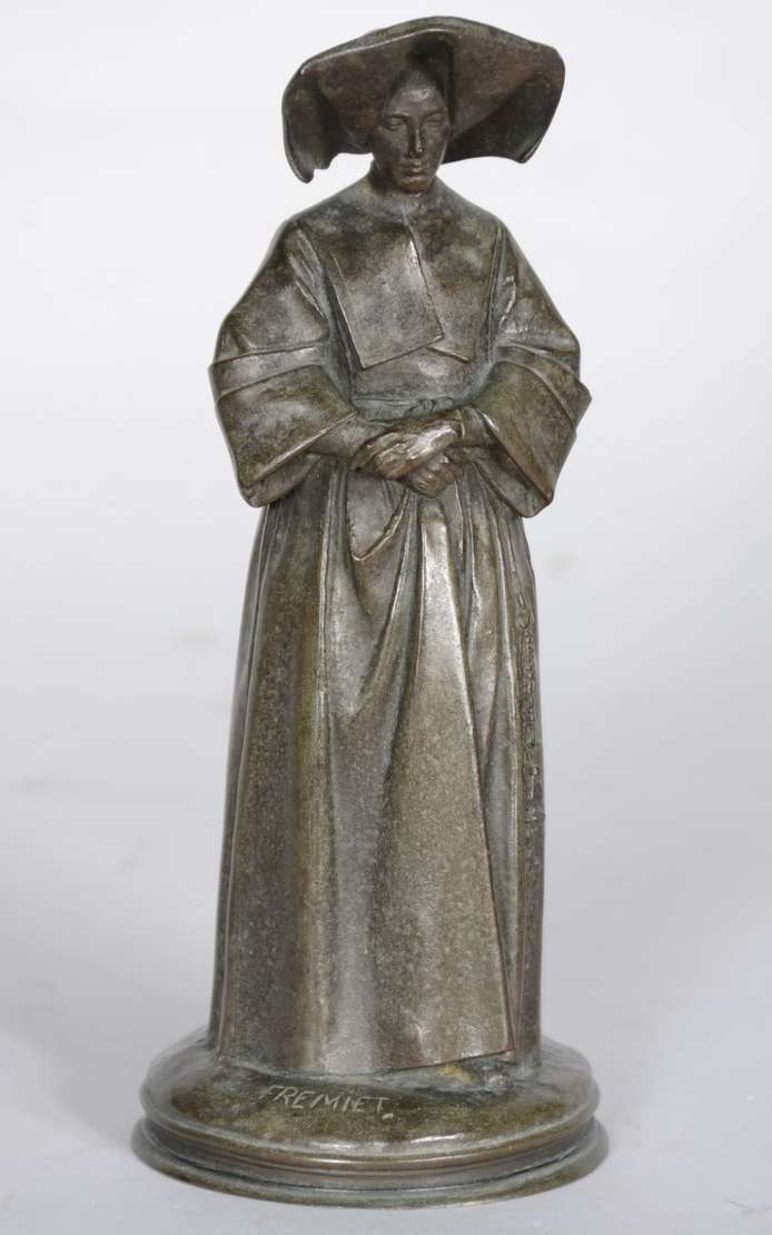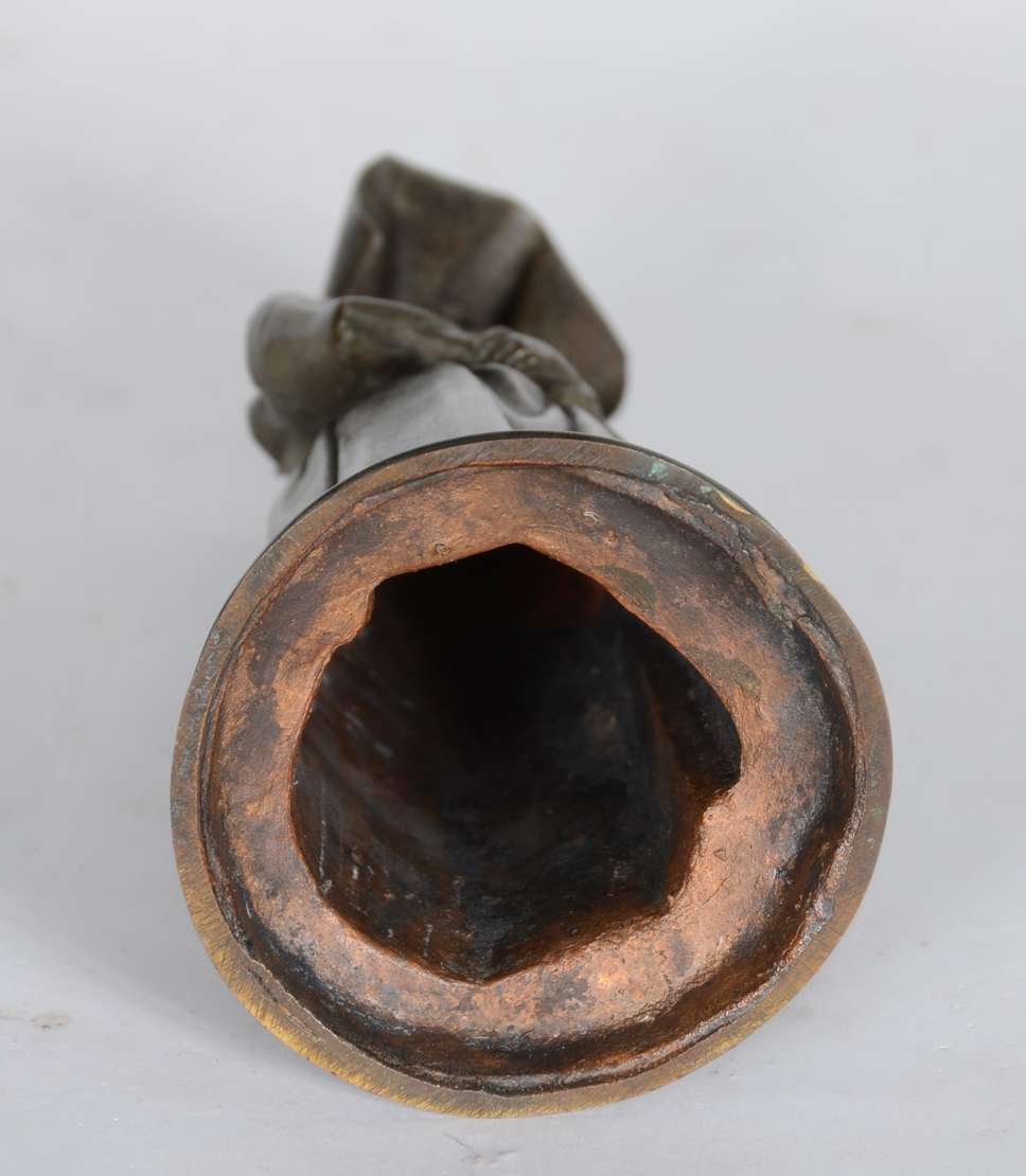 Estatueta de bronze e marfim representando Joana D'arc. Assinada. (possivelmente um sinete)