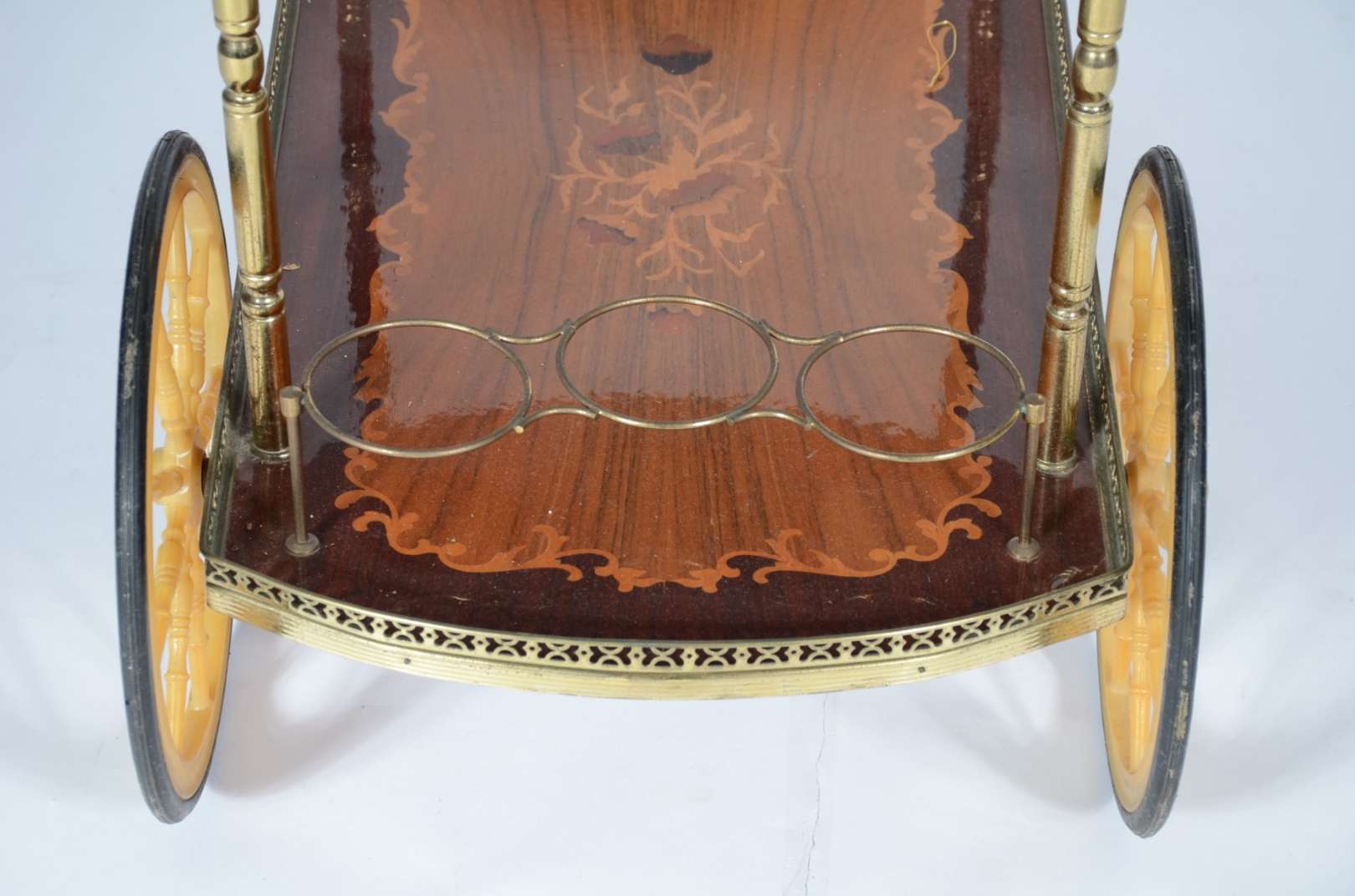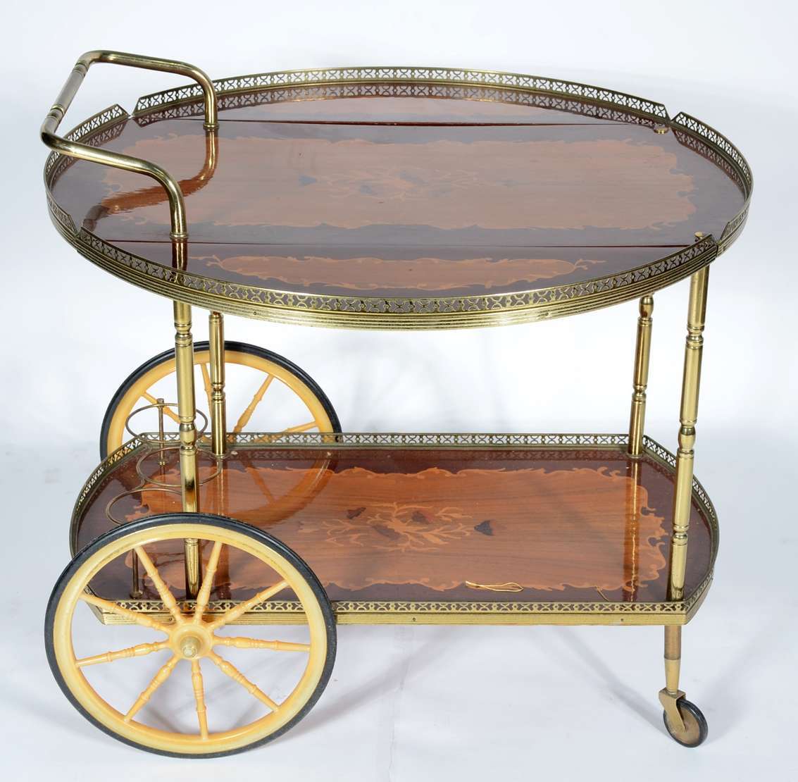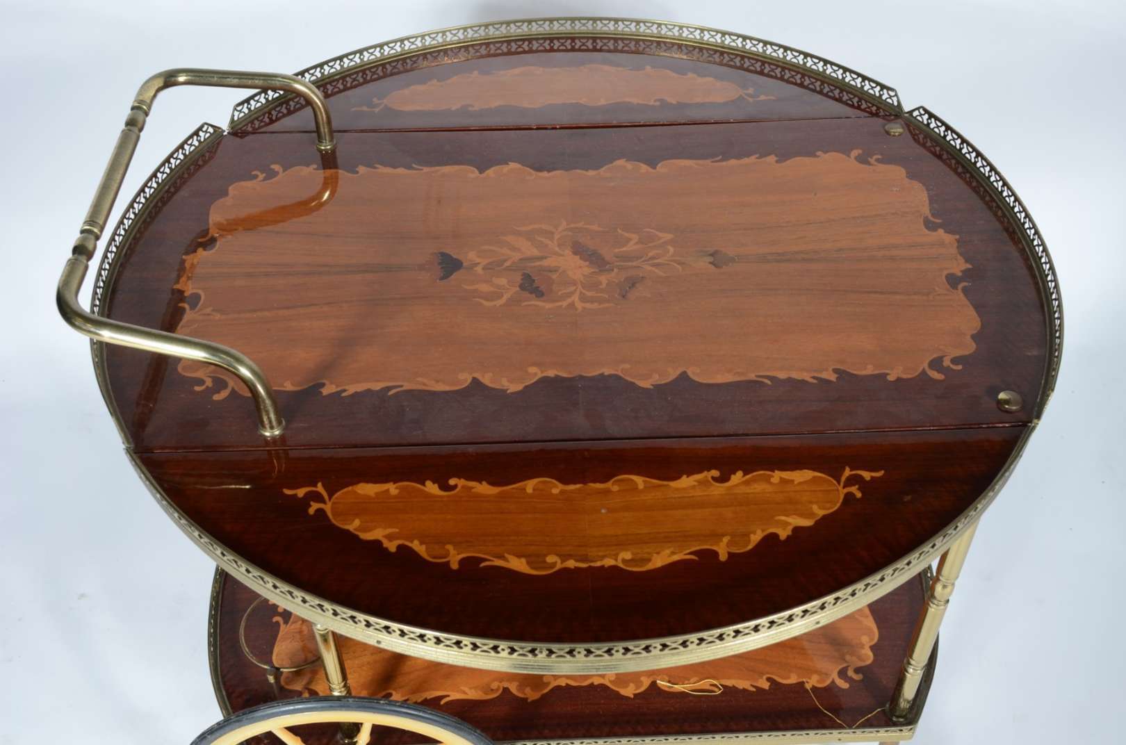 Mesa auxiliar de madeira trabalhada em marqueterie, estilo francês, tampo e laterais de mármore verde rajado.
