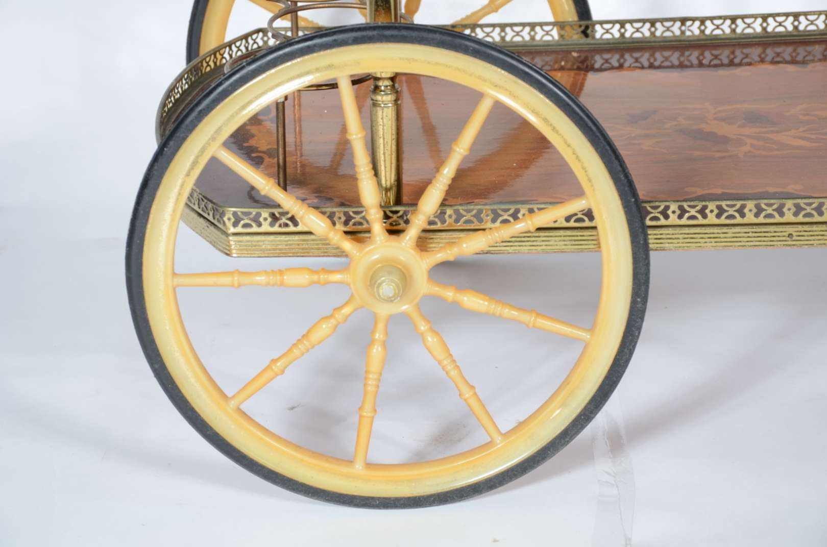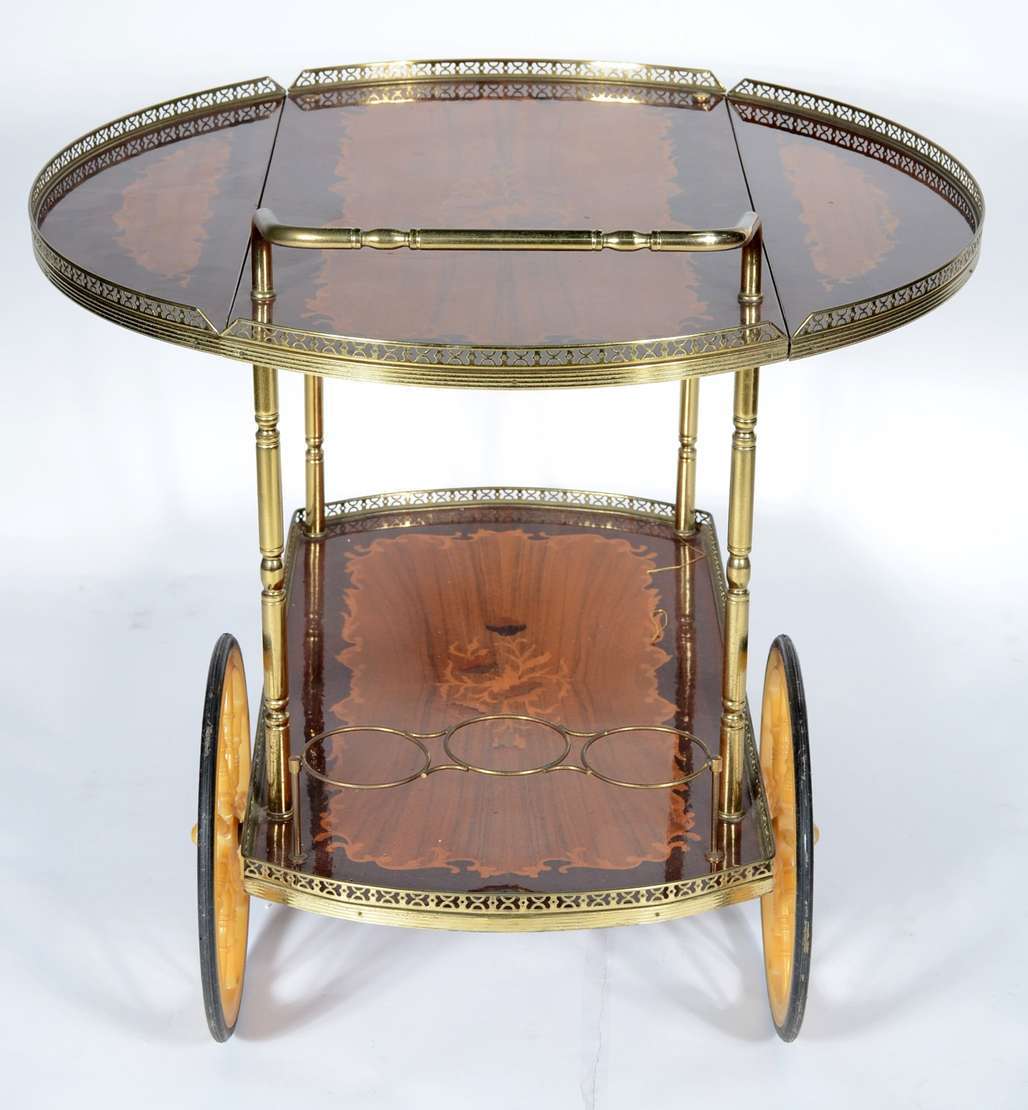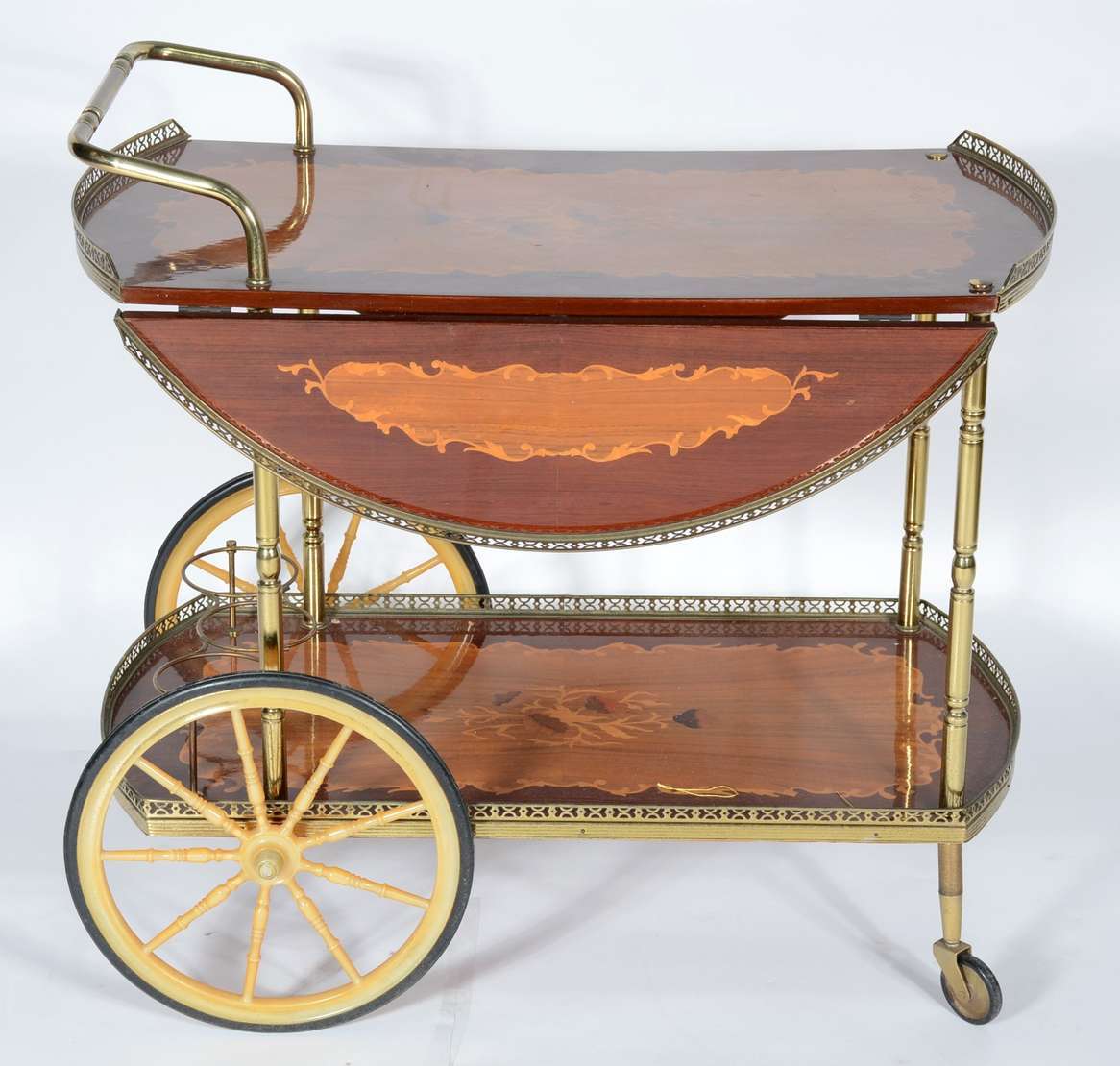 Mesa auxiliar de madeira trabalhada em marqueterie, estilo francês, tampo e laterais de mármore verde rajado.