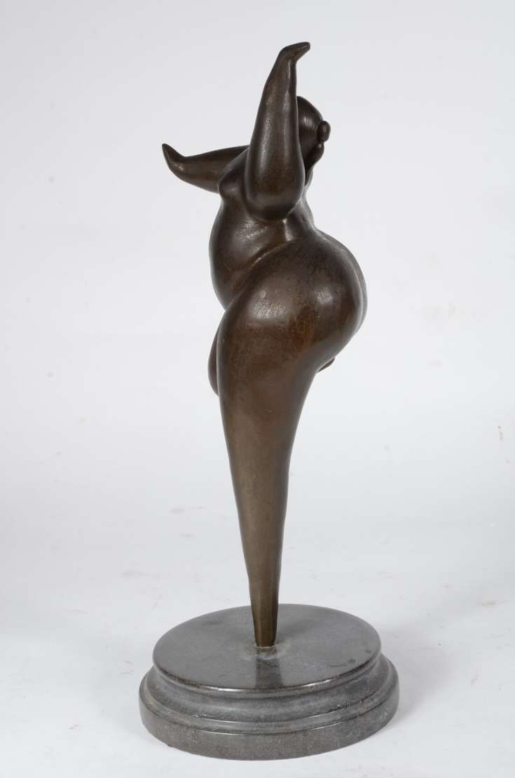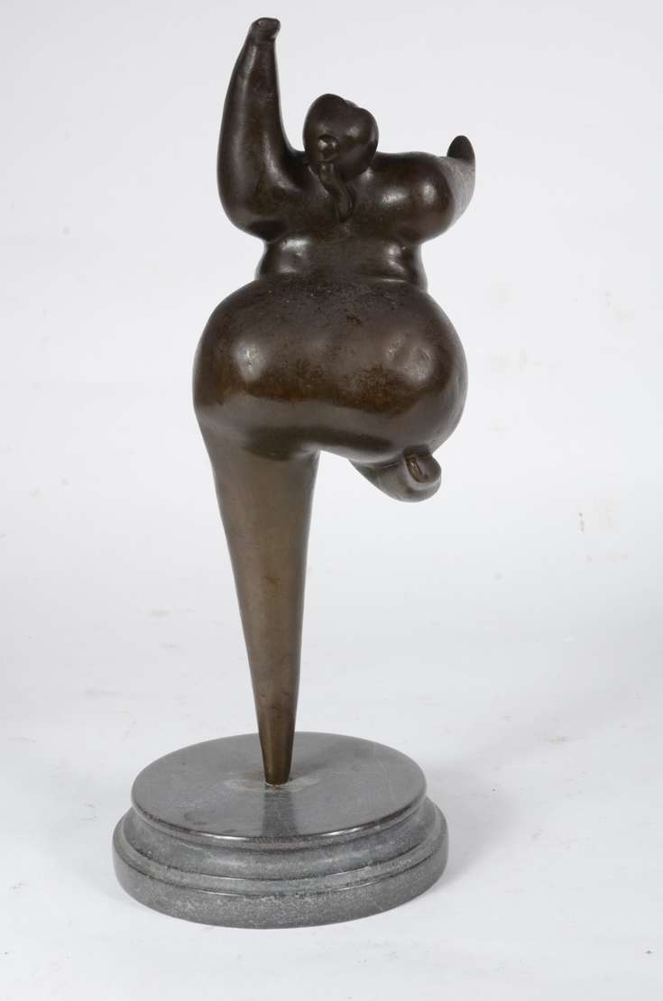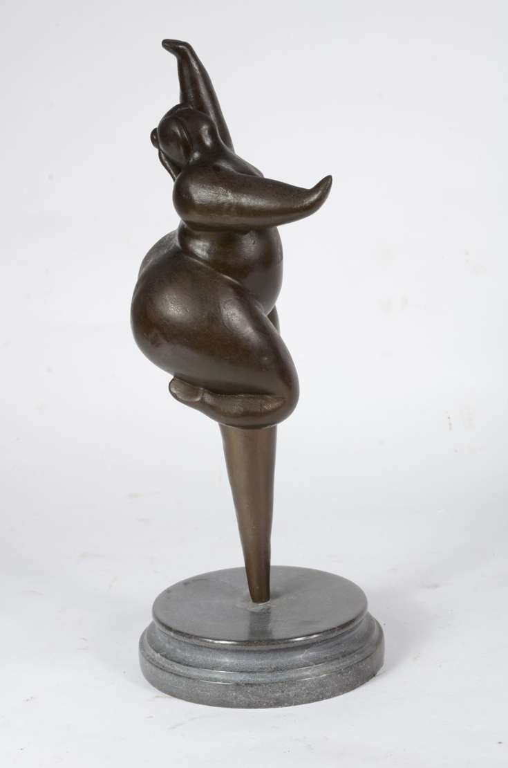 Buda da fertilidade de porcelana policromada, base de madeira.