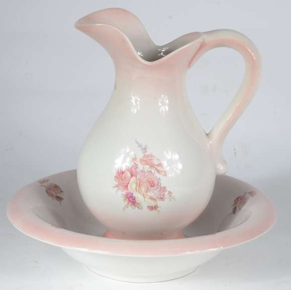 Jarra com bacia de porcelana portuguesa Alcobaça com decoração floral em tons de rosa.