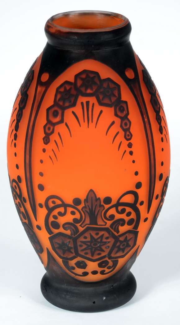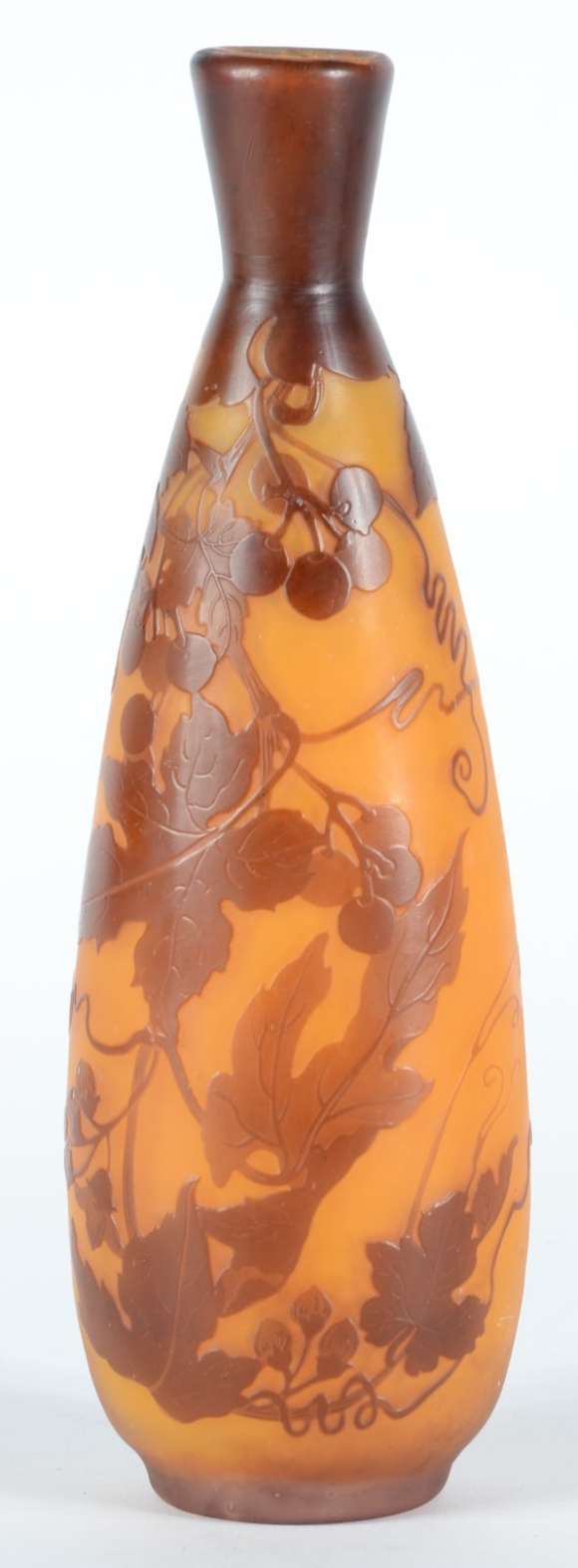 Vaso frances de pasta de vidro acidado com sobrecapa na cor âmbar com fino relevo de folhas e cachos de frutas. Assinado