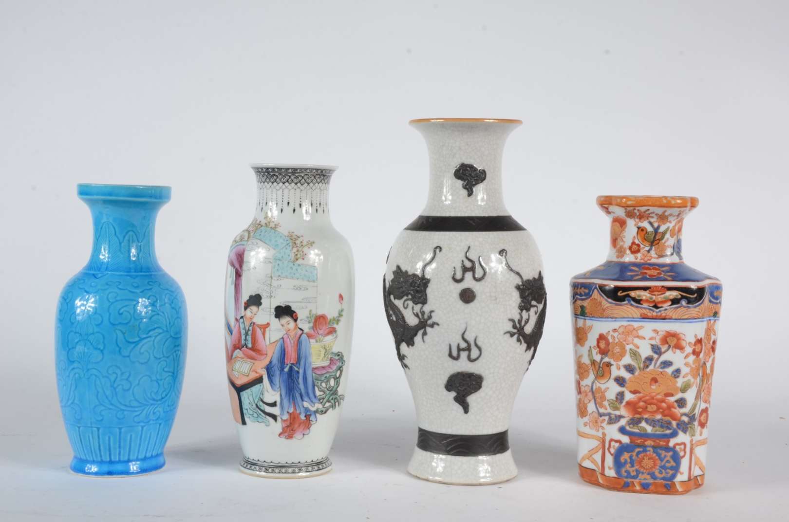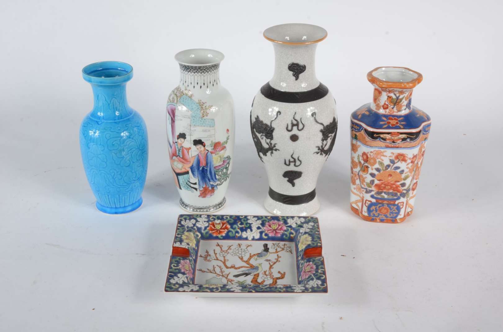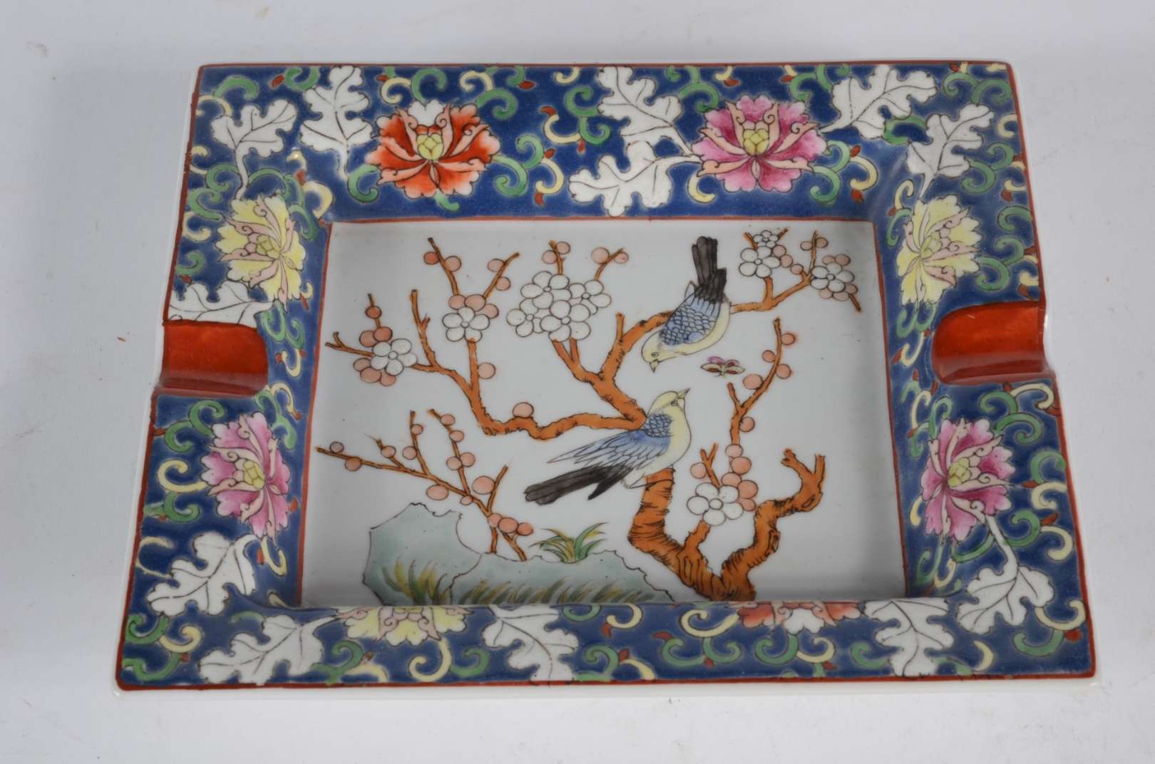 Quatro peças diversas de porcelana oriental policromada, sendo par de pratos oitavados; um prato redondo; e, pequeno ...