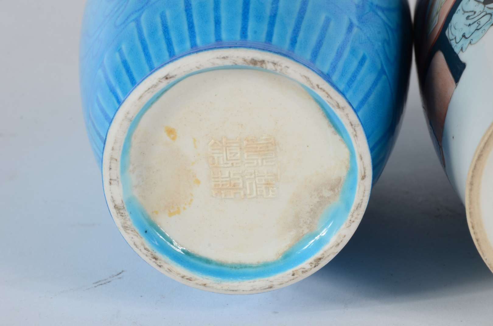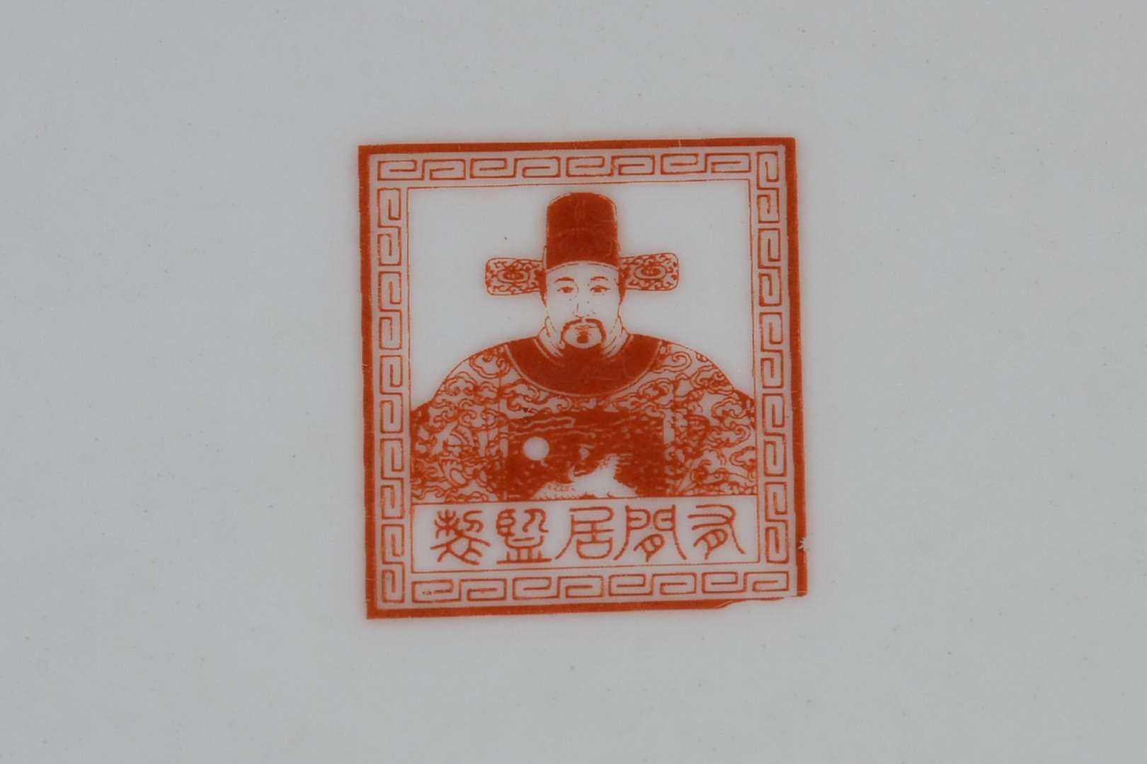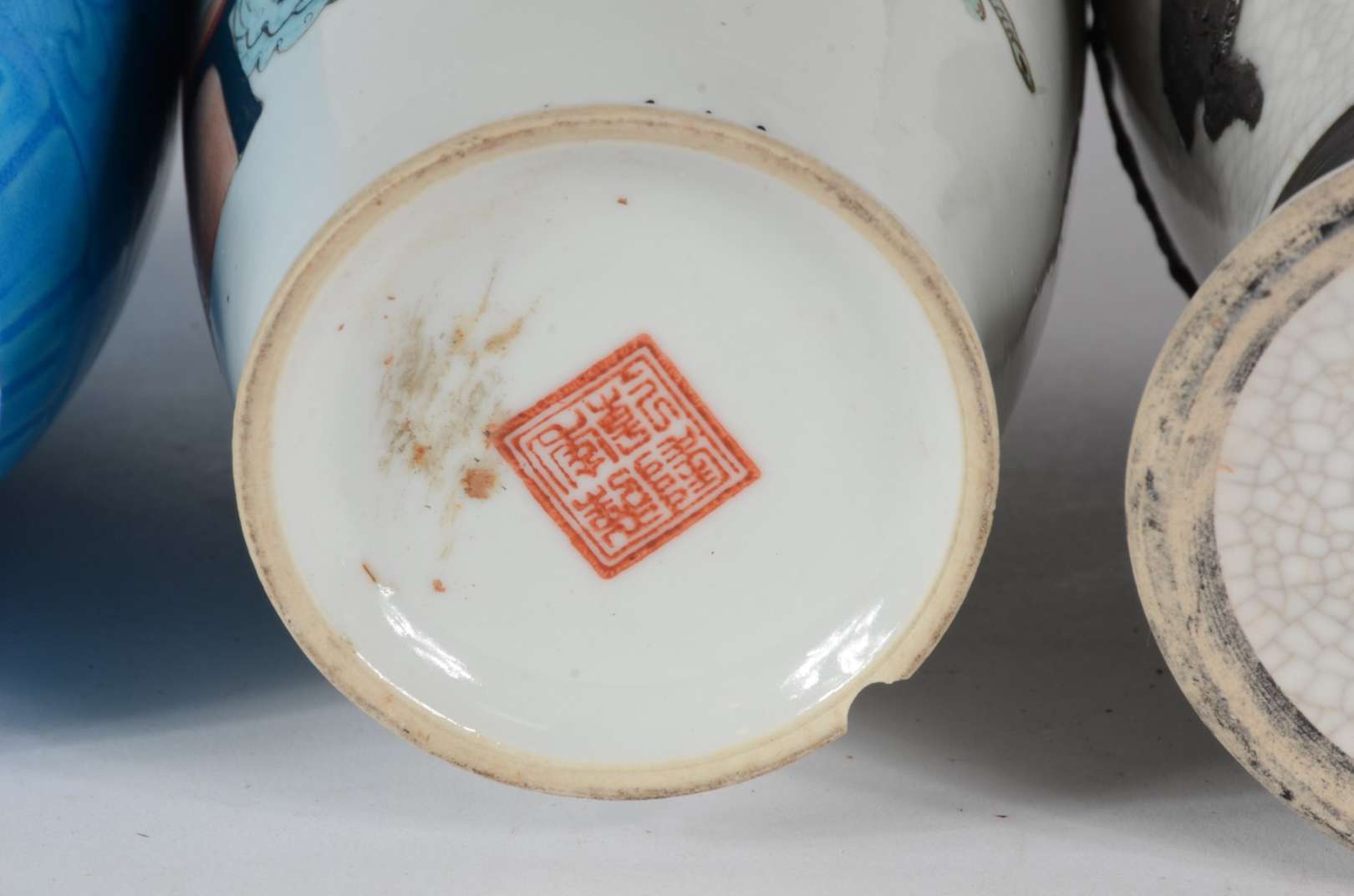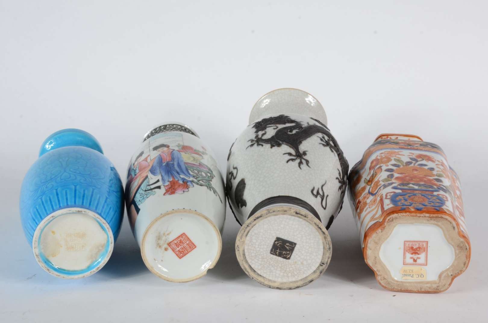 Quatro peças diversas de porcelana oriental policromada, sendo par de pratos oitavados; um prato redondo; e, pequeno ...