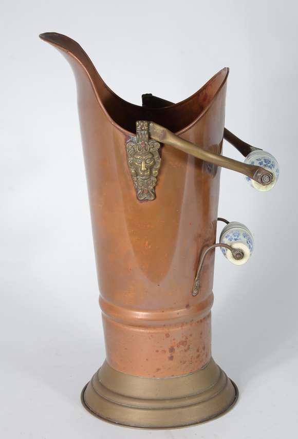 Bengaleiro de metal com alças de cerâmica azul e branca com arremates em placas com "cara de leão" em relevo.