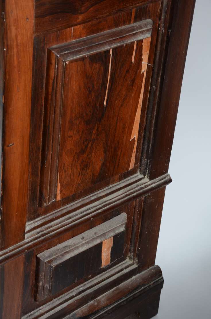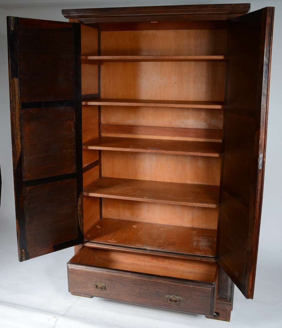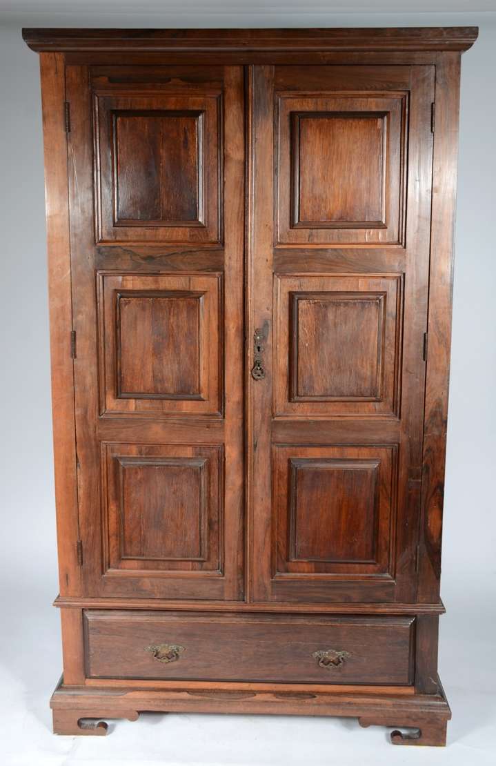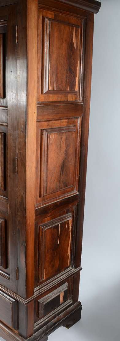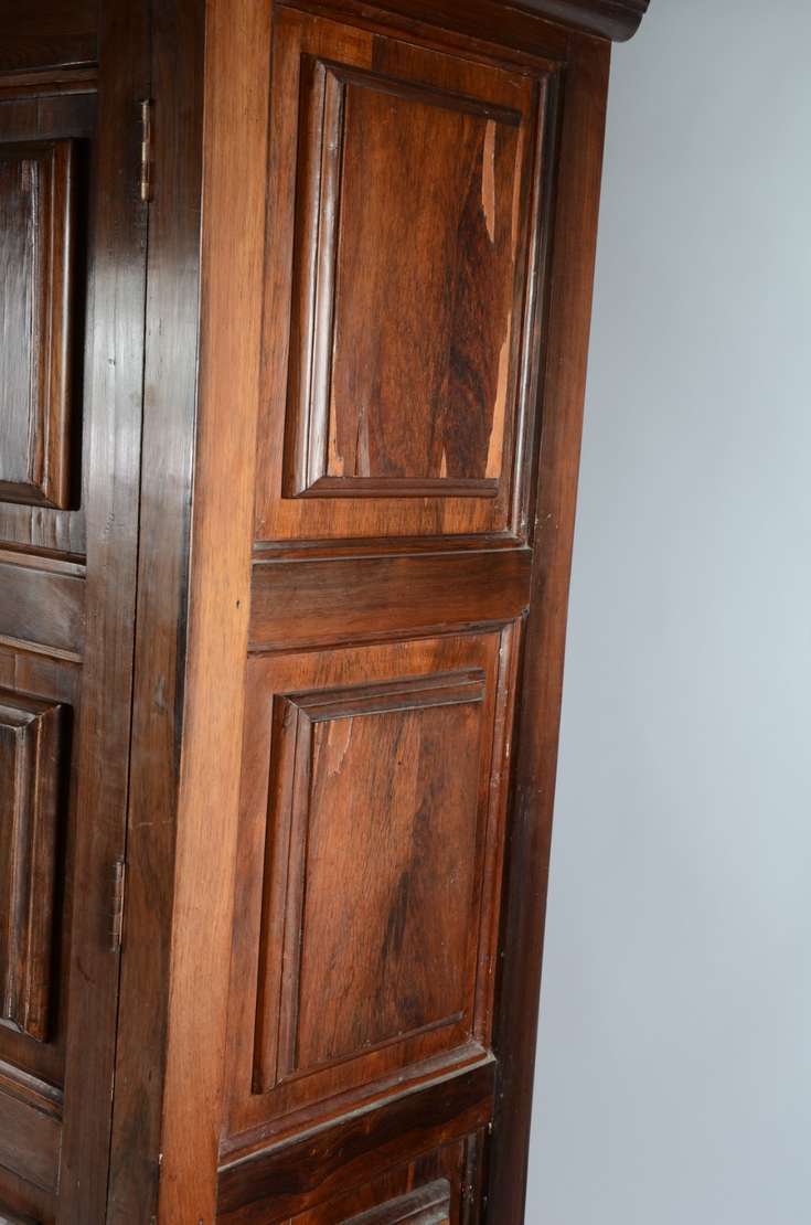 Belíssimo armário de madeira nobre, duas portas almofadadas com parte superior decorada com flores entalhadas e cacho...