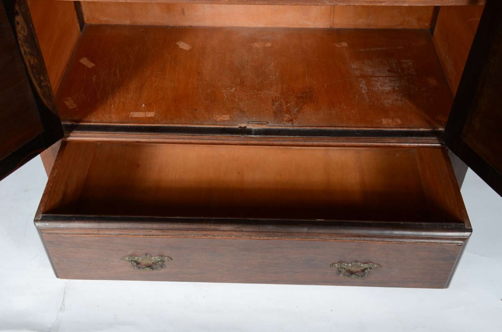 Pequeno móvel chines de lacca negra com aplicações de pedras na forma de gueixas e pagodes, duas portas com prateleir...