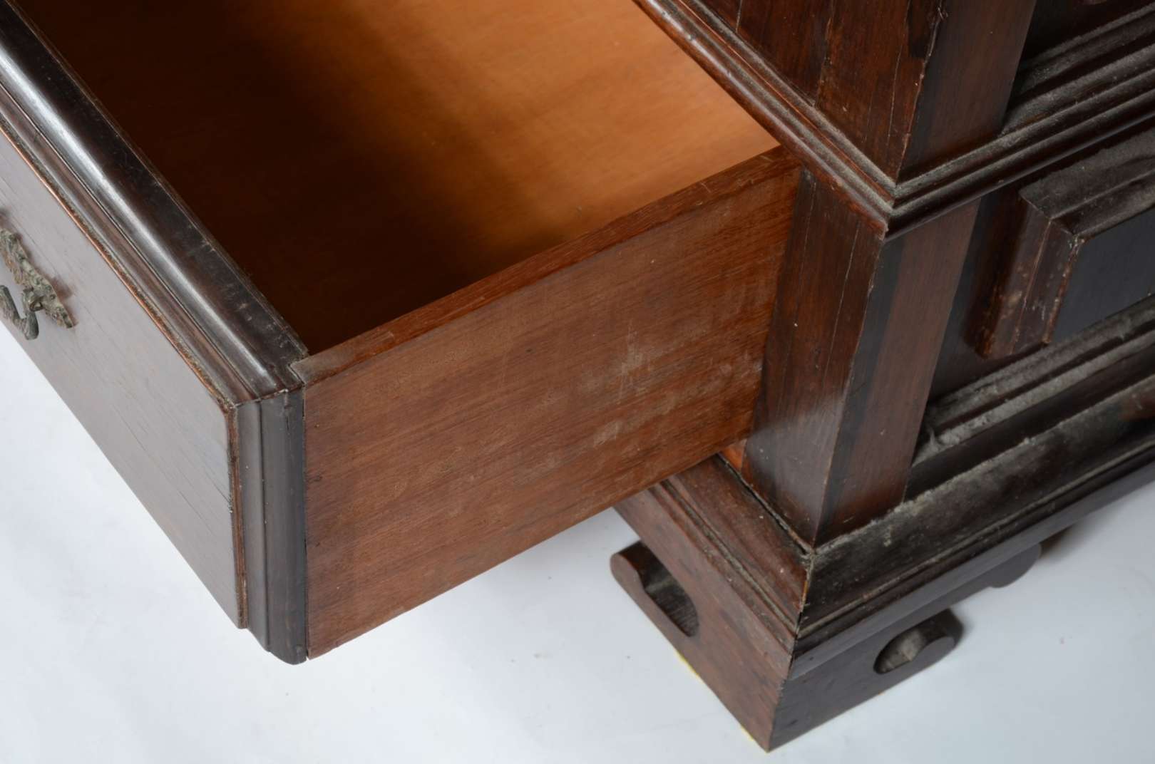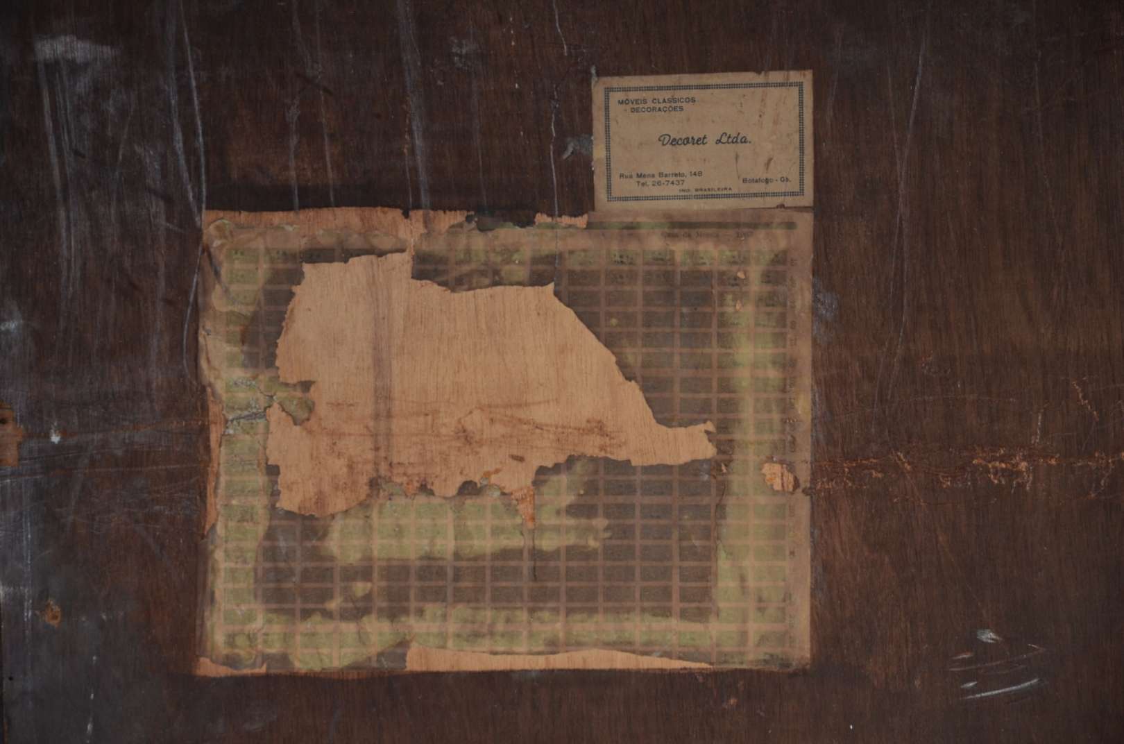 Mesa de encostar de madeira nobre, estilo Dom José, duas gavetas com puxadores de metal, saia entalhada e recortada, ...