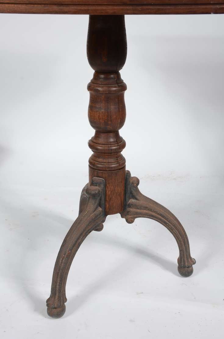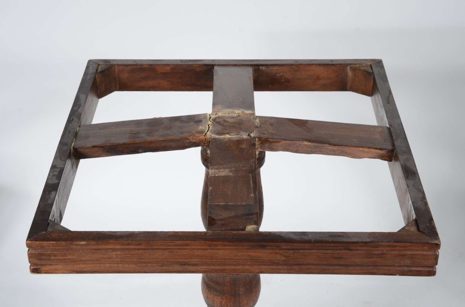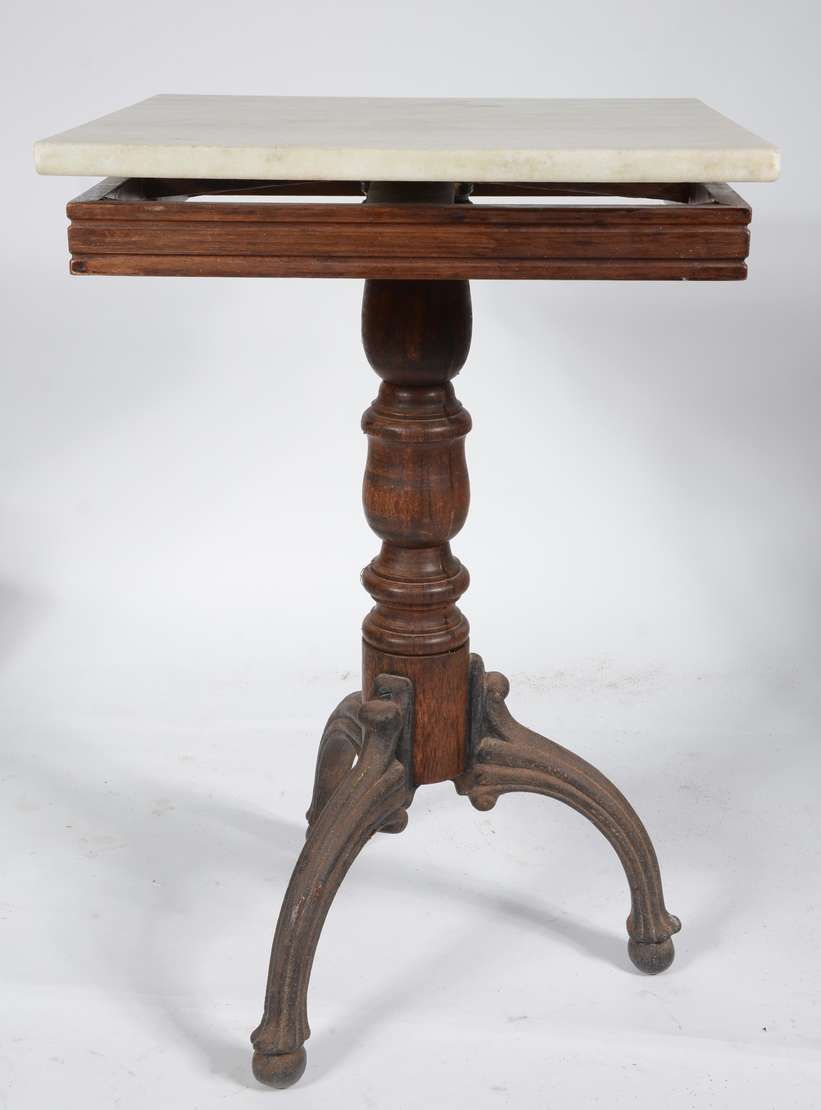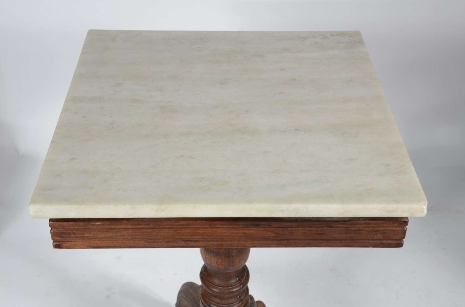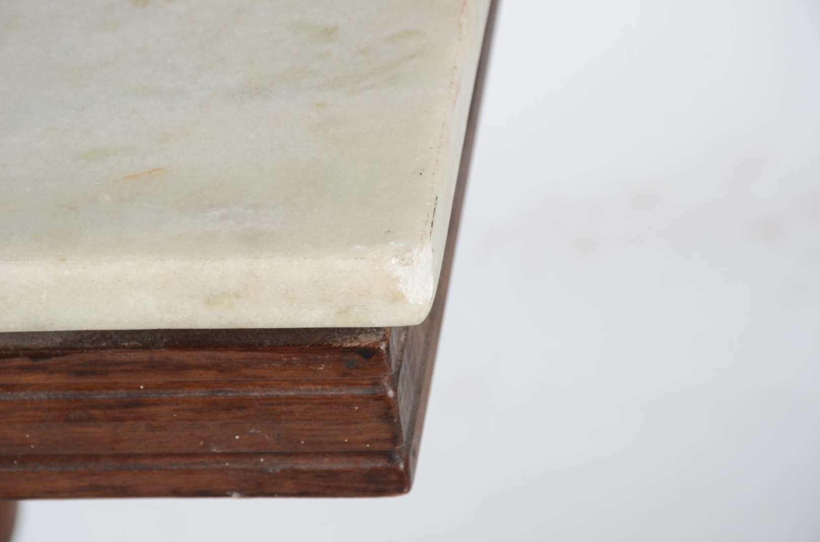 Mesa auxiliar de madeira trabalhada em marqueterie, estilo francês, tampo e laterais de mármore verde rajado.